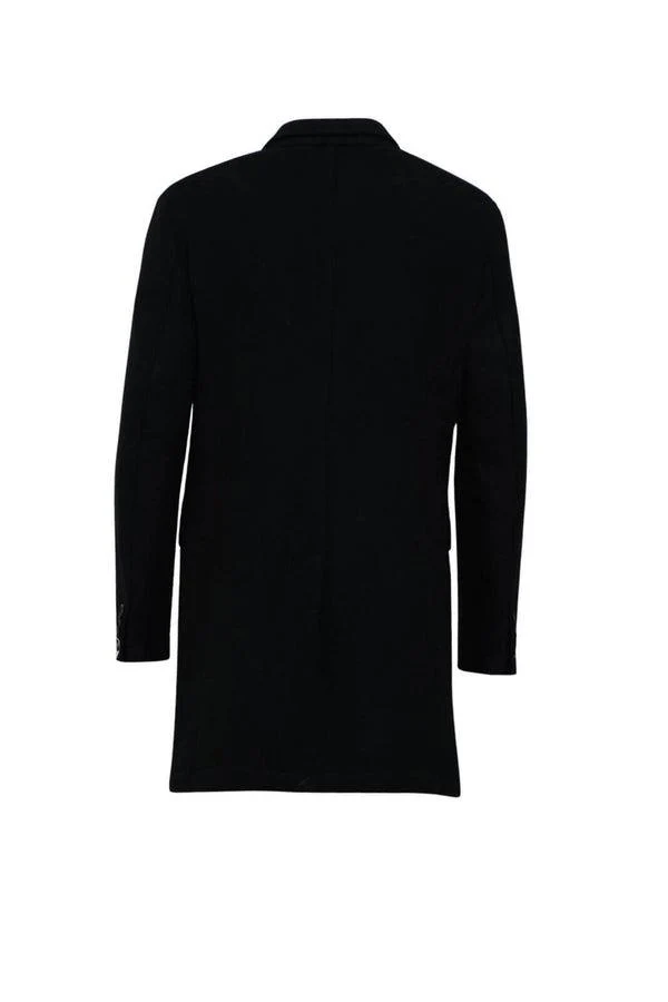Cappotto Nuvola sfoderato, chiusura a due bottoni, rever a lancia, due tasche a pattina frontali, quattro bottoni ai polsi, finiture con impunture. Panno in misto lana, colore nero