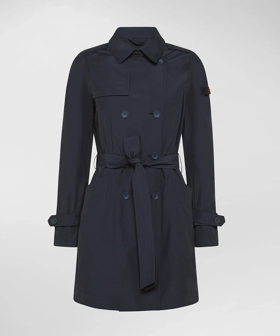 Cappotto doppiopetto nero Peuterey, chiusura centrale con bottoni e cintura con fibbia ardiglione, chiusura con zip nascosta, tasche laterali con patta, cappuccio fisso con coulisse, colore nero