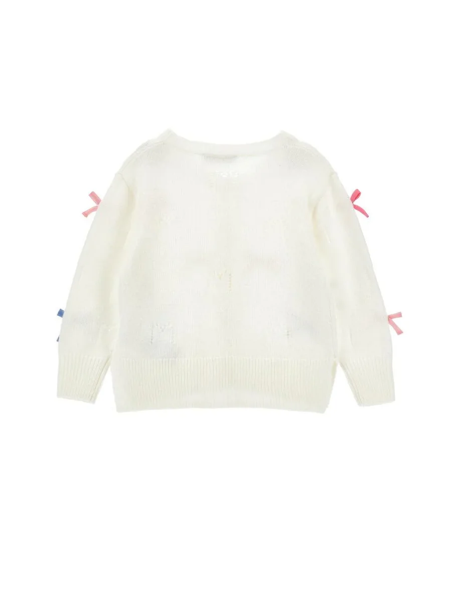 Cardigan Monnalisa bambina, apertura frontale con bottoni, fiocchi in contrasto all over, colore bianco