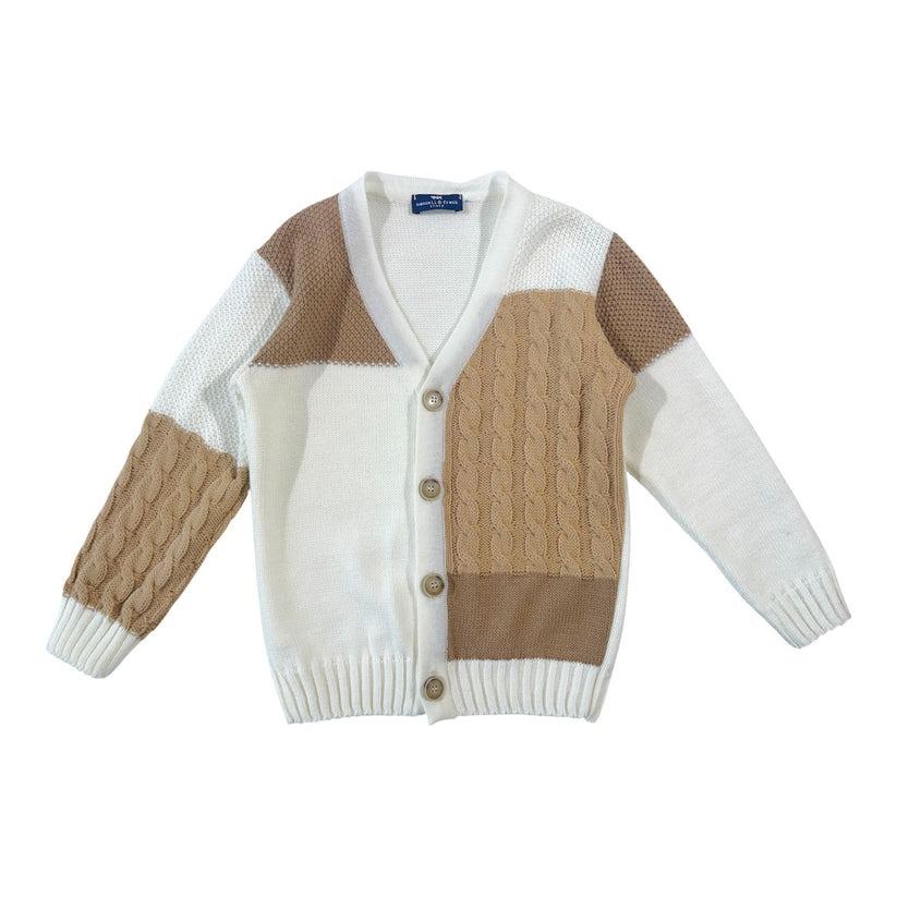 Cardigan Manuell & Frank, modello con ampio scollo, dettagli con lavorazione a trecce, colore panna e beige