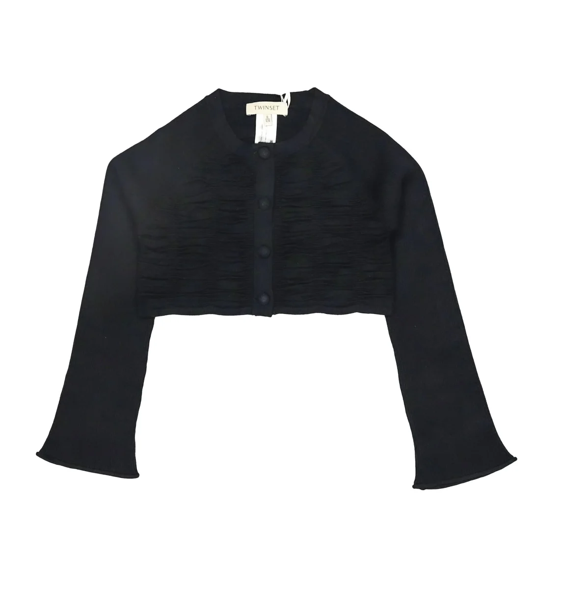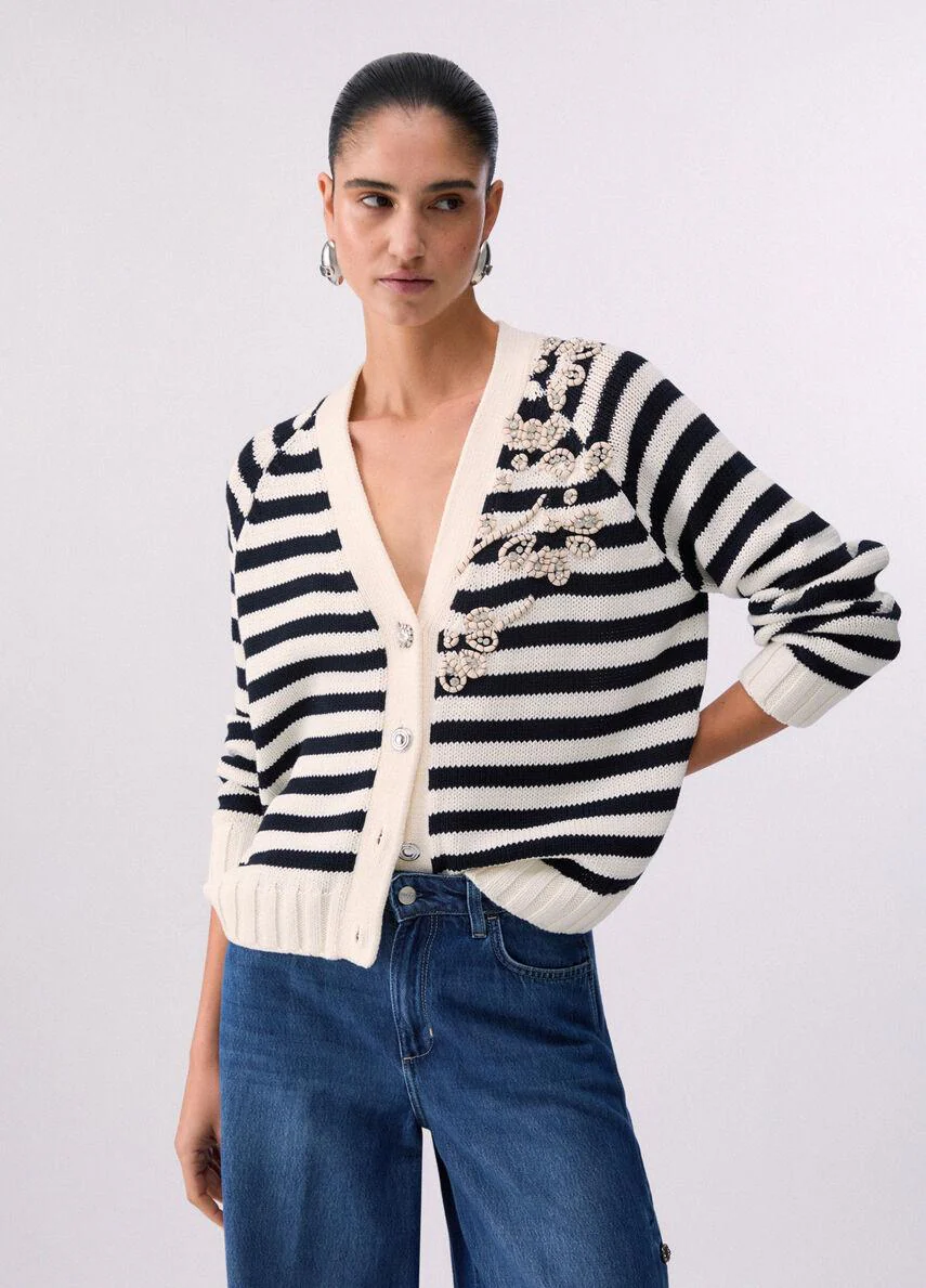 Cardigan a righe, ricamo gioiello e nastro bold a contrasto, scollo a V, chiusura con bottoni gioiello