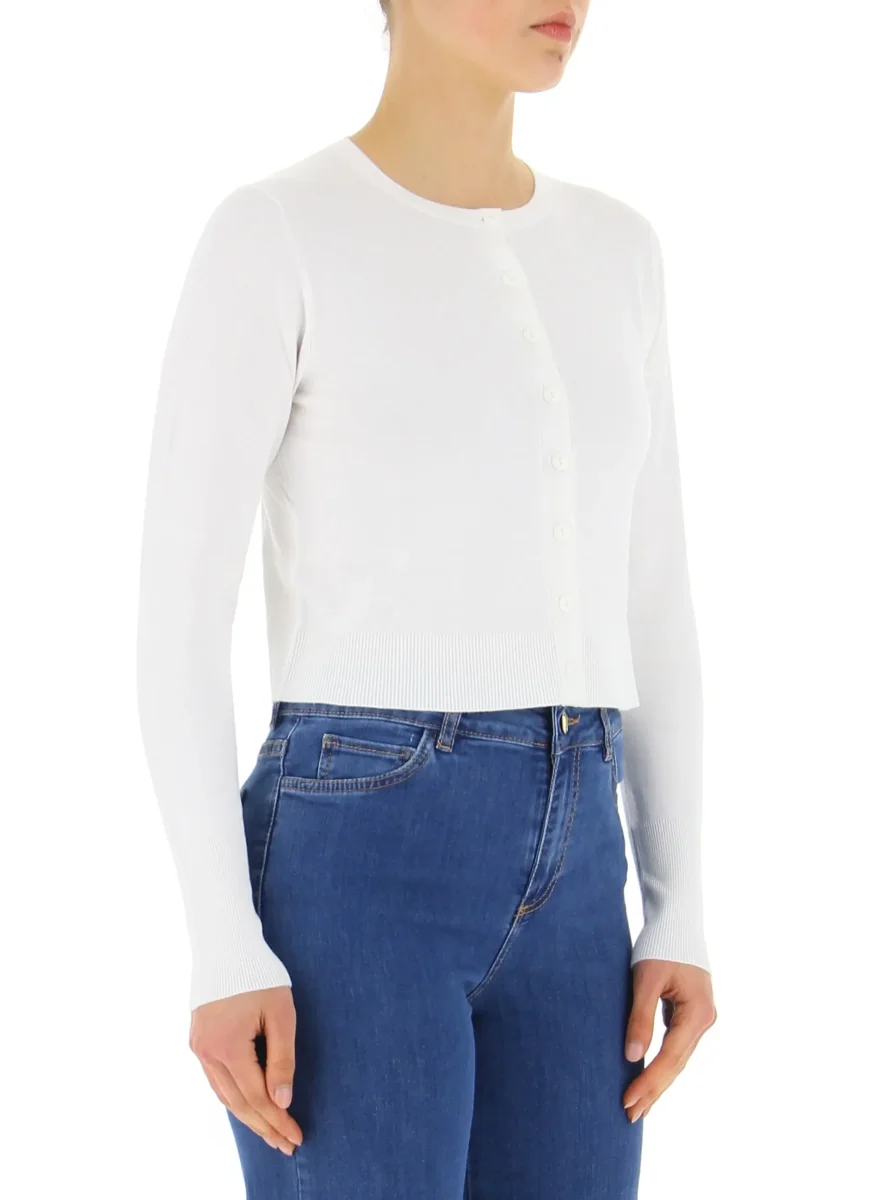 Cardigan cropped Emme Marella, realizzato in maglia di viscosa stretch con bordi a coste, scollo rotondo maniche lunghe, chiusura con bottoni, colore bianco