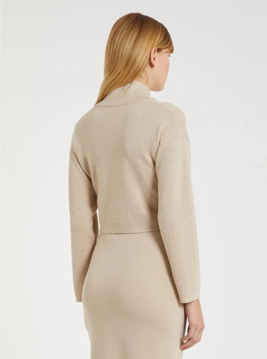 Giacca in filato di pura lana vergine extrafine, applicazioni micro borchie all over, collo alto, zip all over, linea cropped, colore beige