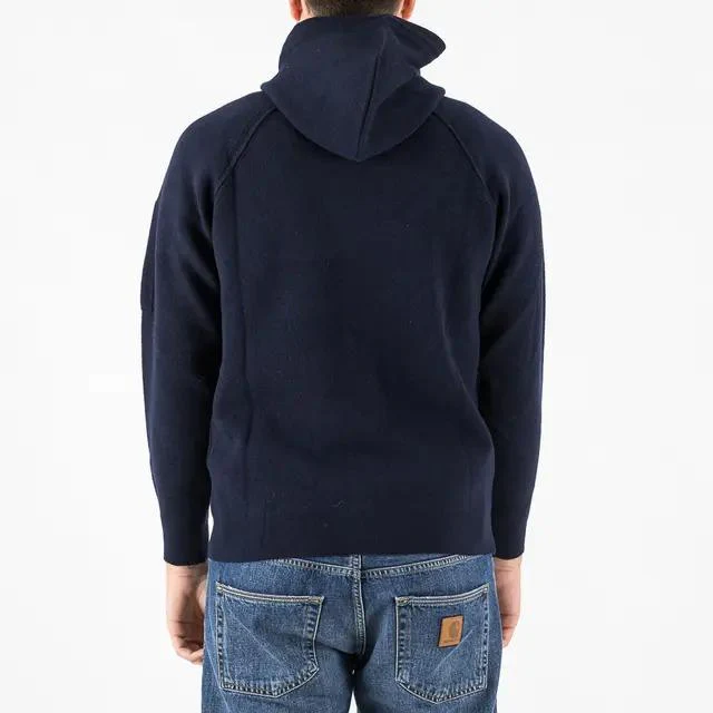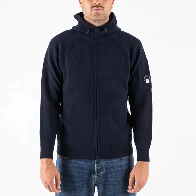 Maglione con cappuccio e full zip CP Companu, modello realizzato in lambswool, cuciture a contrasto, taschino con lente e regular fit, colore beige