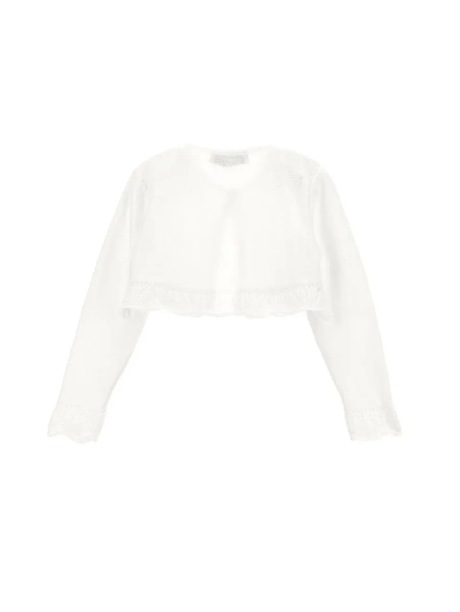 Cardigan elegante Monnalisa, modello in filato di cotone, scollo rotondo e bototne gioiello, profilo smerlato, colore bianco