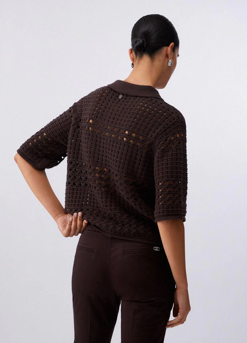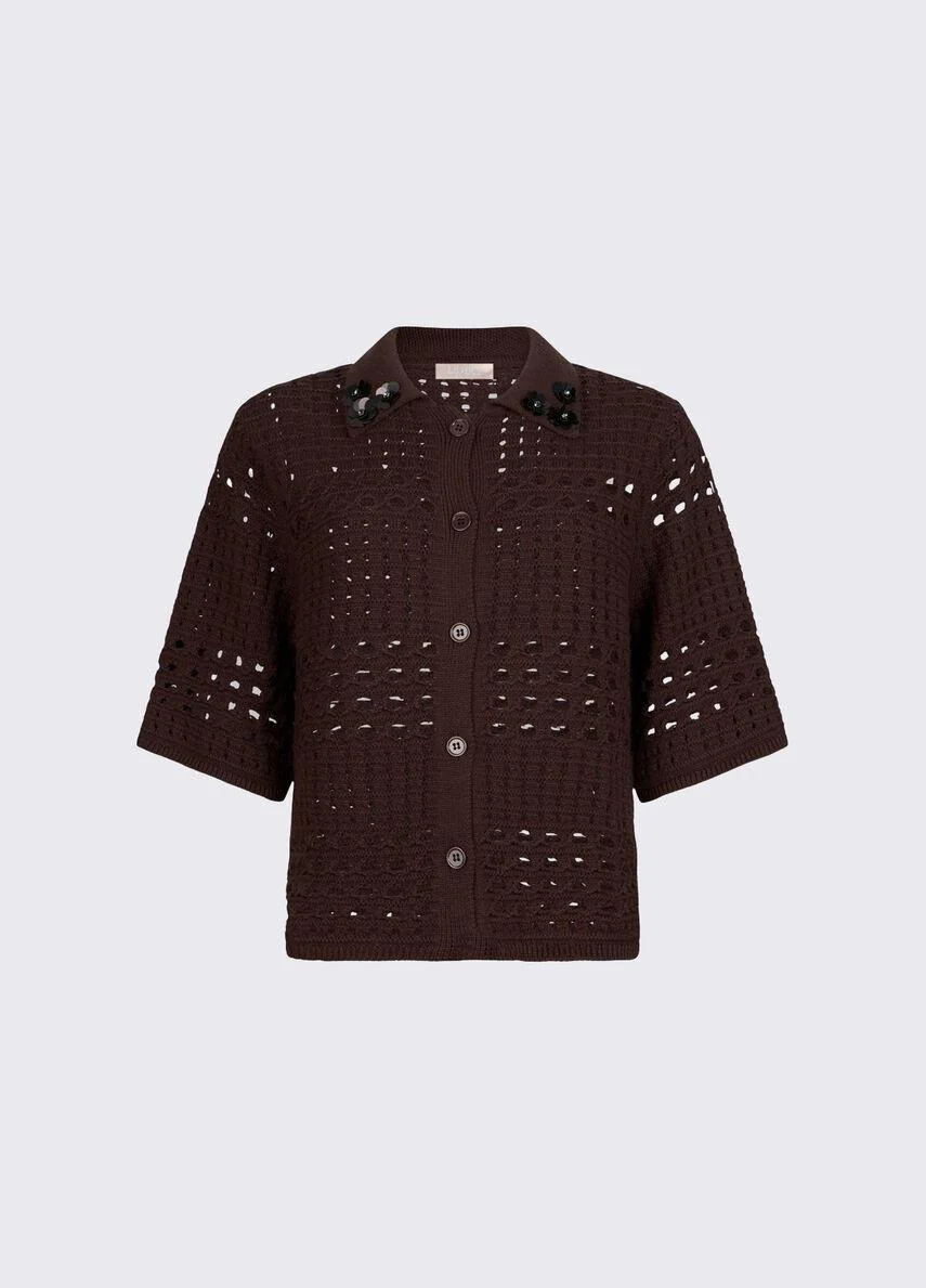 Cardigan in crochet di cotone, colletto con ricami, maniche corte e chiusura con bottoni in tono colore, colore marrone