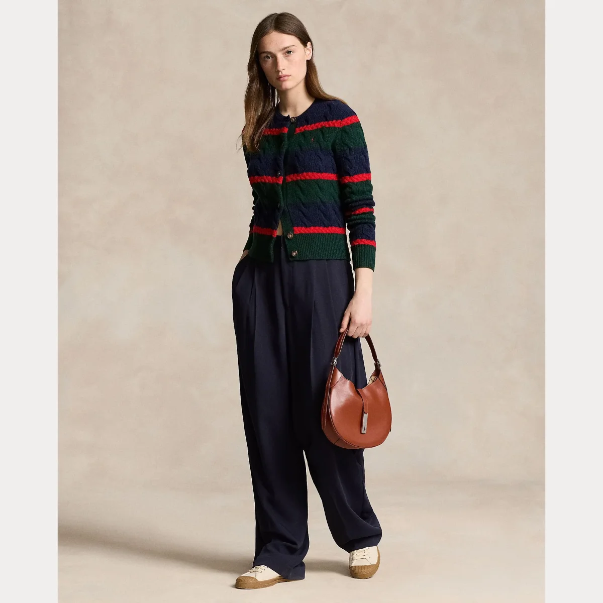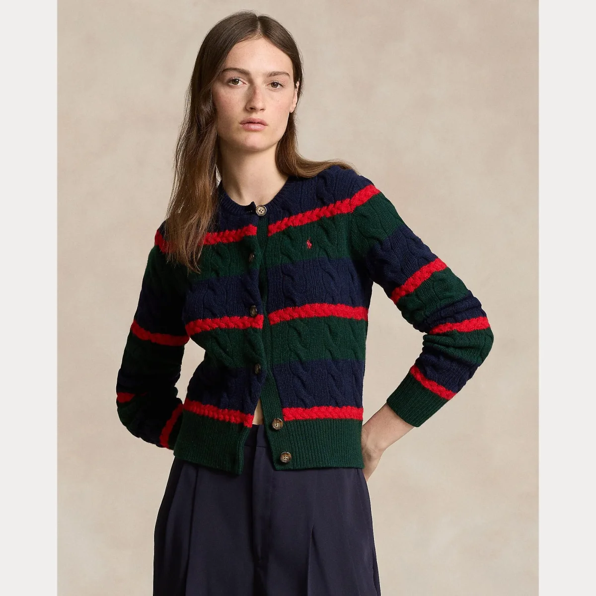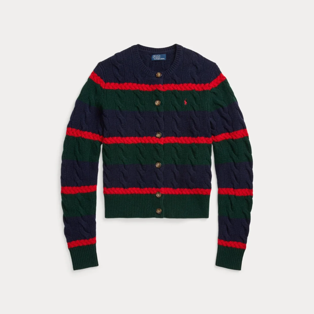 Maglioncino in morbida lana e cashmere Polo Ralph Lauren, modello girocollo caratterizzato dalla tipica lavorazione a trecce e pony ricamato in contrasto