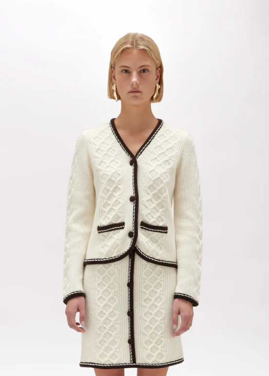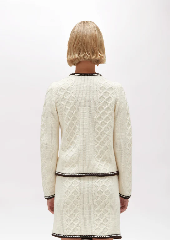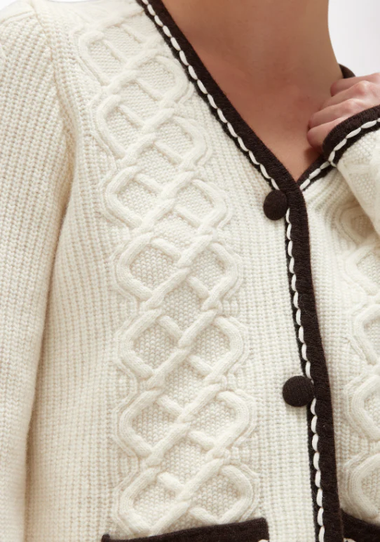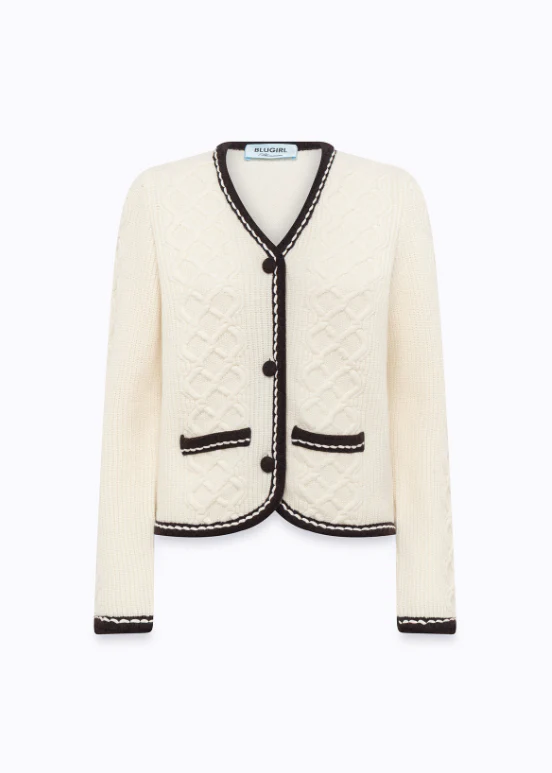 Cardigan in misto lana con profili in contrasto colore, scollo a V, maniche lunghe, chiusura con bottoni effetto loden, tasche davanti, colore bianco