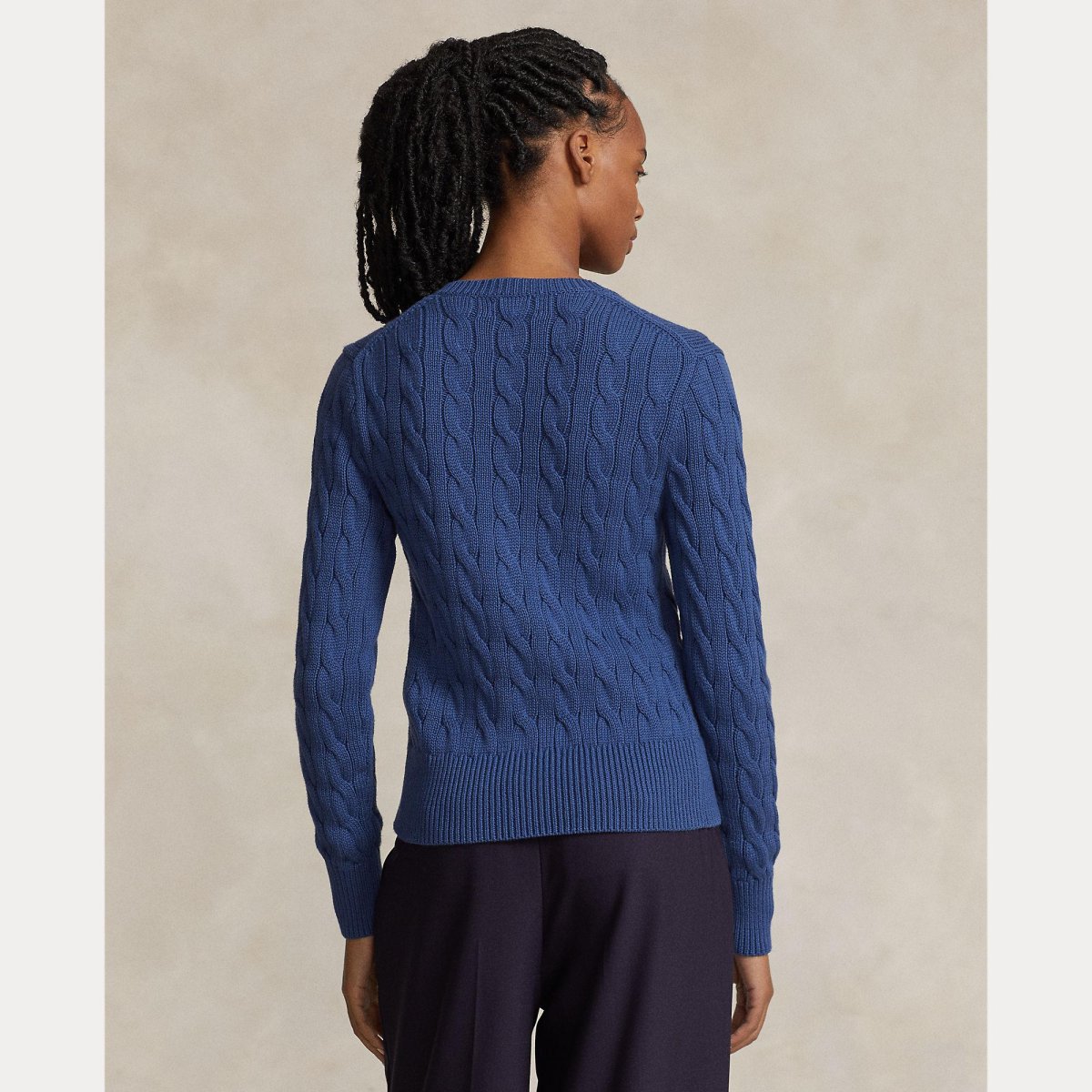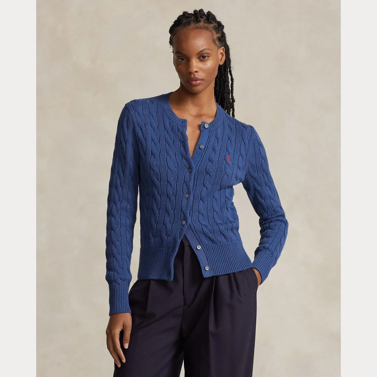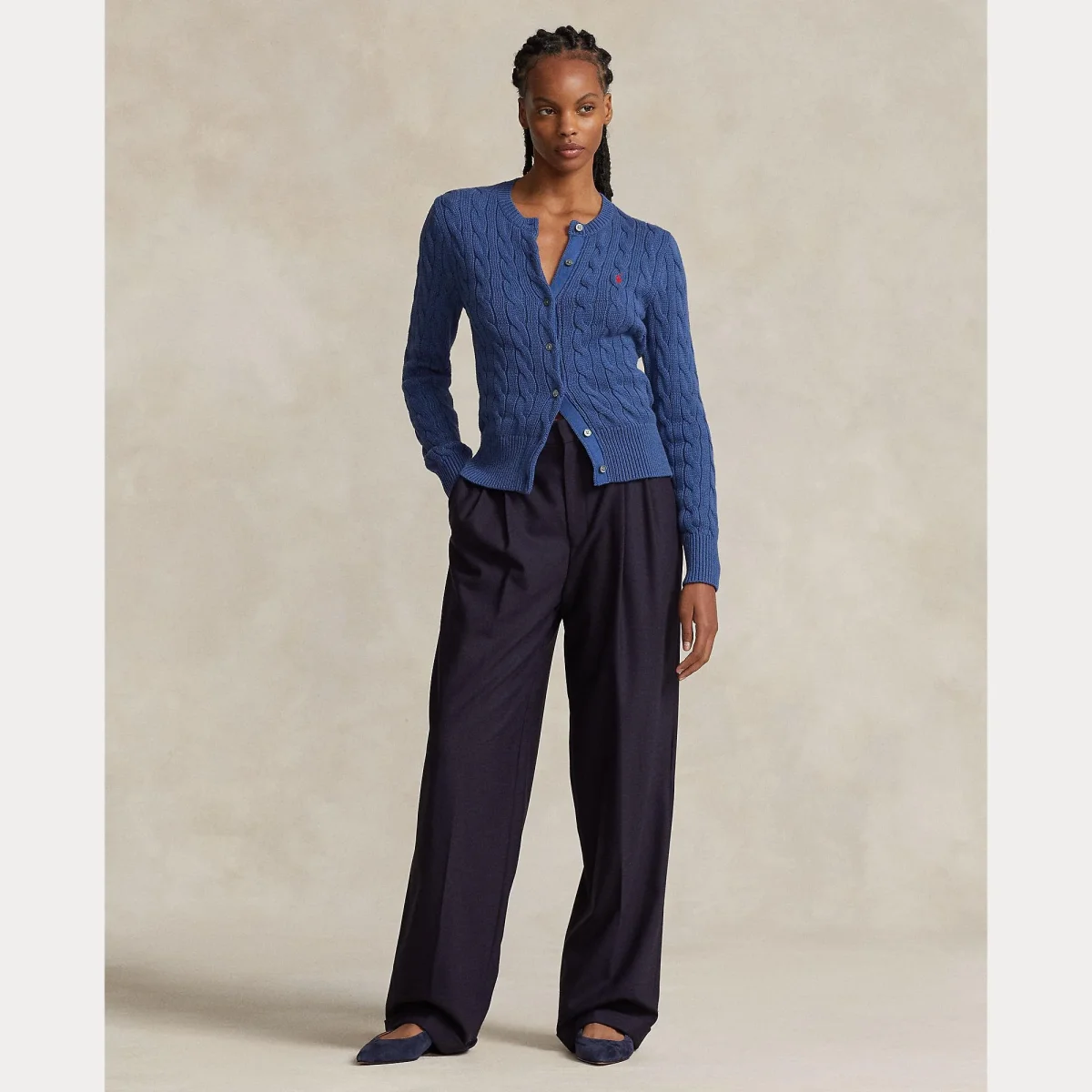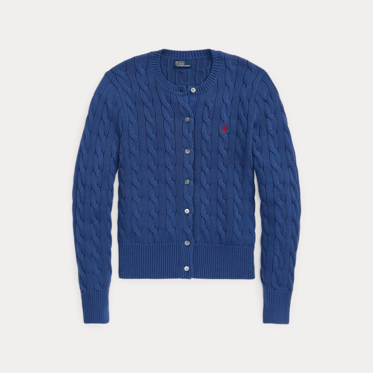 Maglioncino lavorato a trecce Ralph Lauren, modello in puro cotone, modello a cardigan girocollo sottile, ricamato con pony sul petto, colore blu