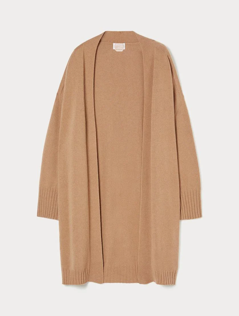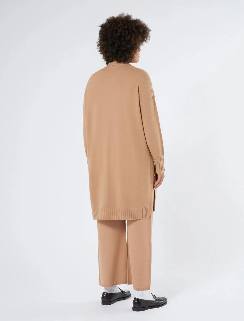 Cardigan in misto cachemire, maniche lunghe, ampi spacchi laterali finiture a costine, colore cammello