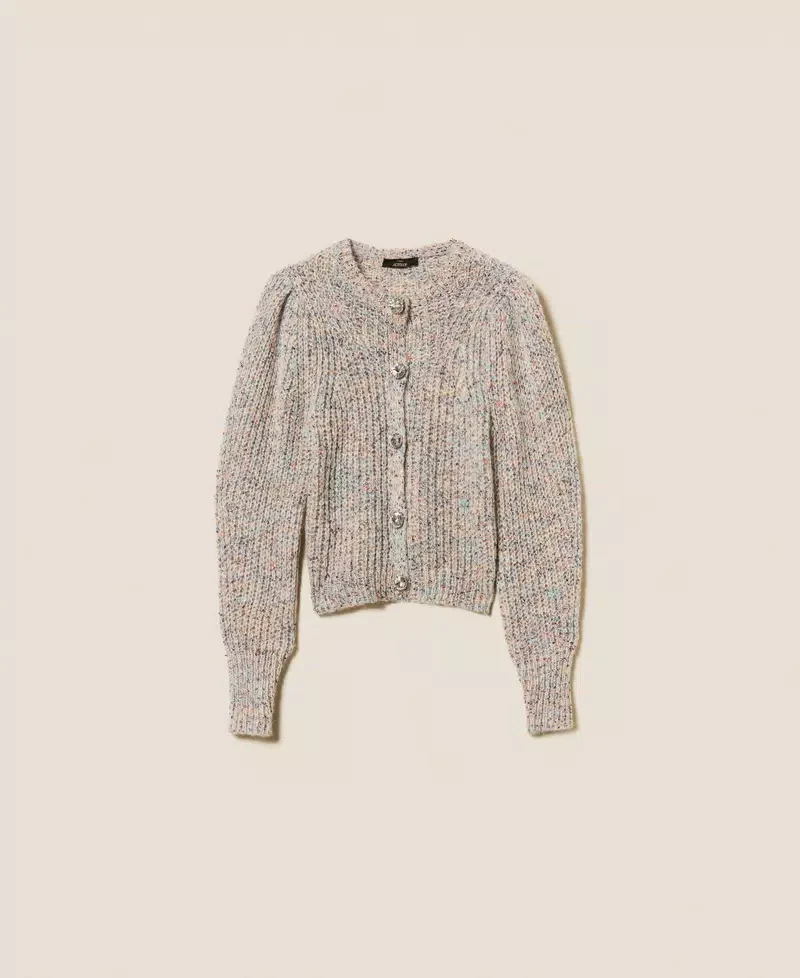 Cardigan in filo multicolor con lavorazione a punto pannocchia, collo alla coreana, chiusura con bottoni gioiello, placchetta logo sul retro