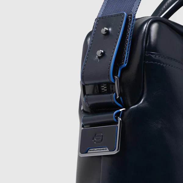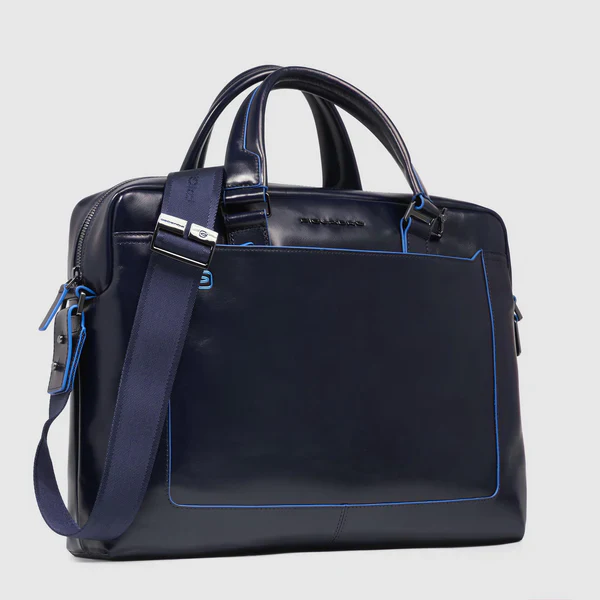 Borsa a cartella Piquadro in pelle, scompartimento interno da 14″ per noteboook e porta Ipad pro da 12,9″, protezione antiurto, tracolla sganciabile, colore blu