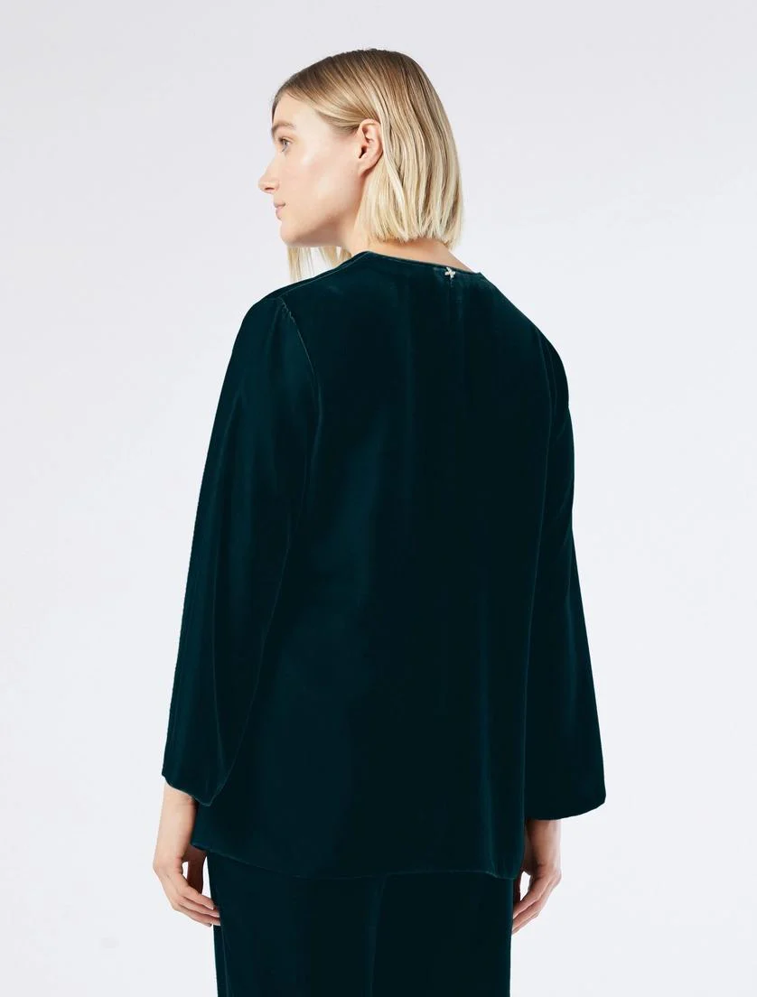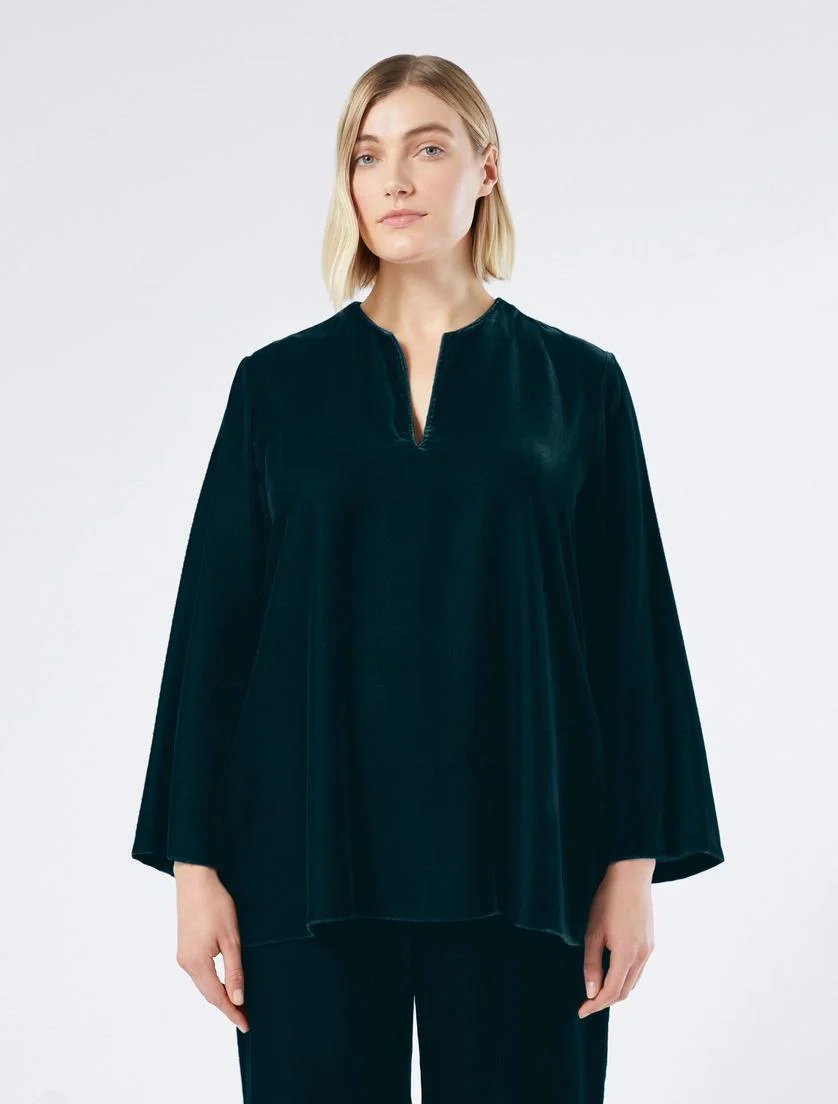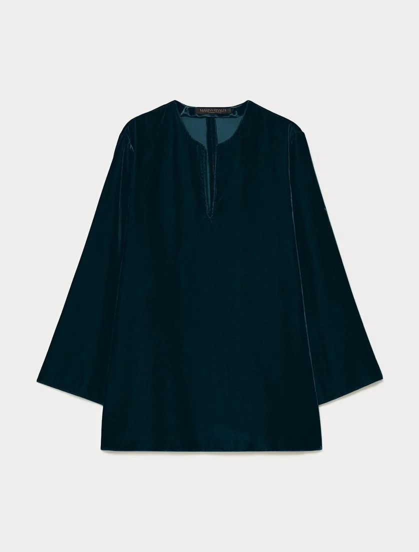 Casacca in velluto, linea svasata, apertura a V rifinita da puntino sartoriale, maniche a giro svasate al fondo, spacchi ai fianchi, colore petrolio