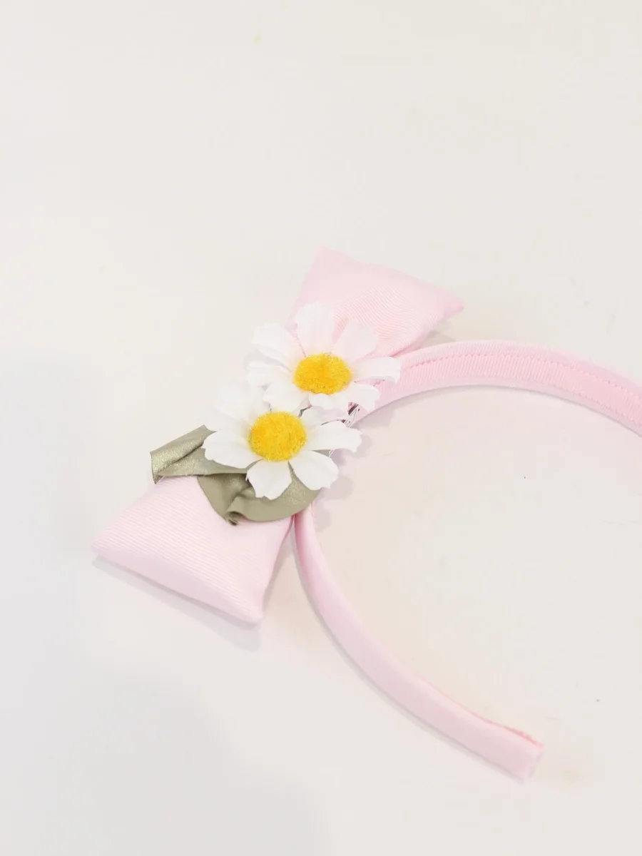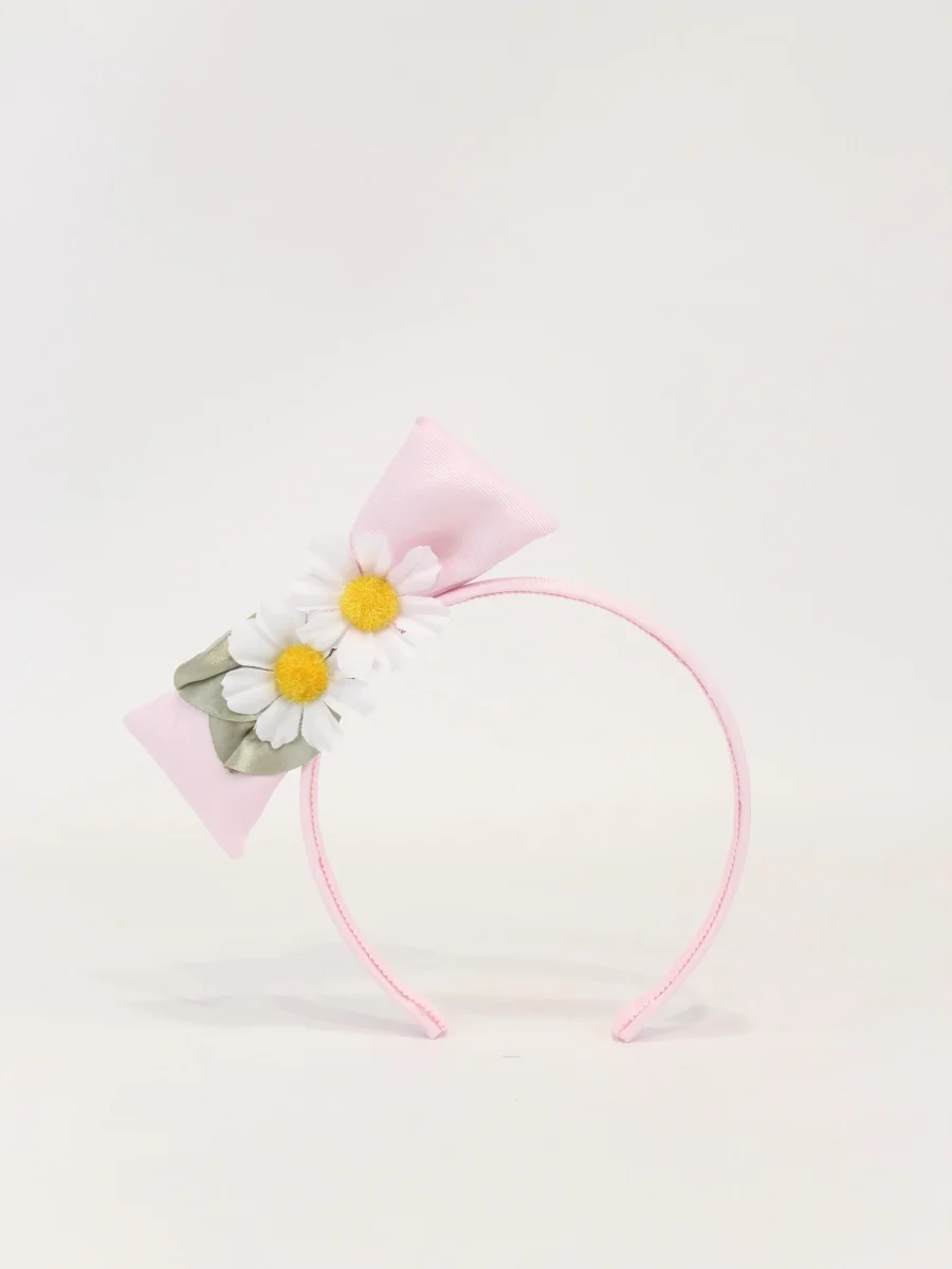 Cerchietto con maxi fiocco con margherite applicate, modello con base in gros grain