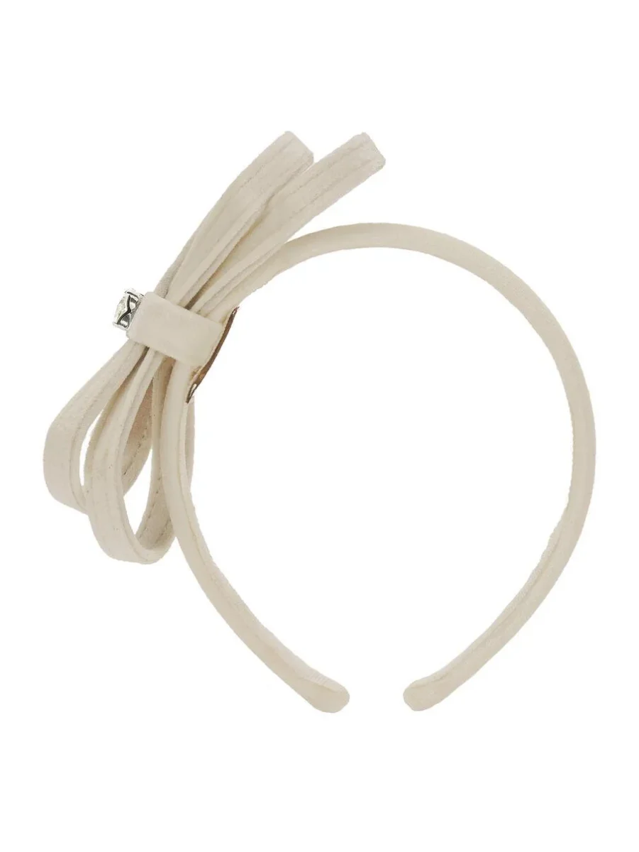 Cerchietto in velluto liscio Monnalisa bambina, doppio fiocco con castone centrale e profili in gros, colore beige