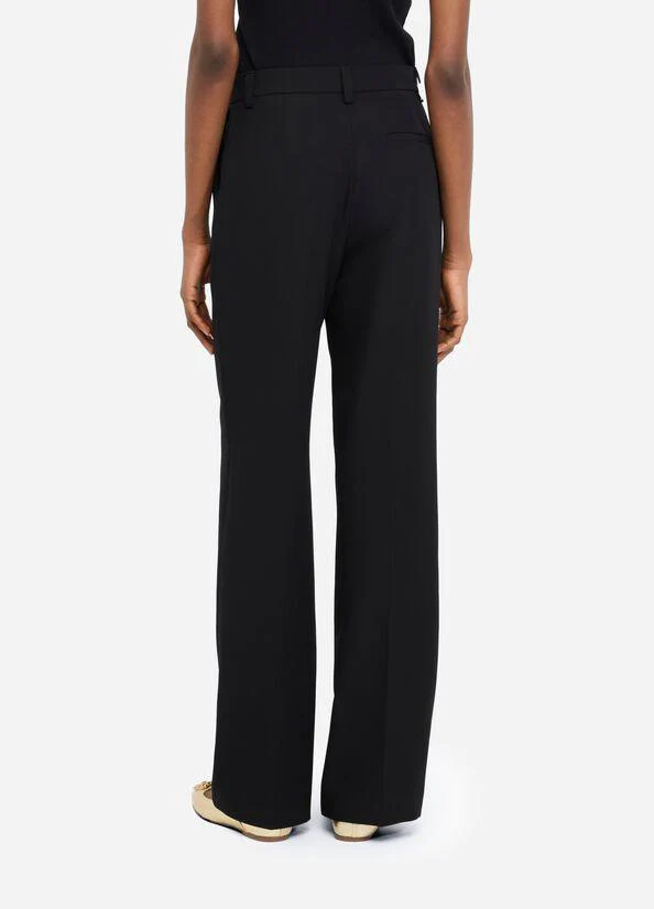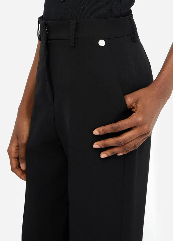 Pantalone a palazzo in tessuto tecnico stretch, vita alta, comode tasche, tasche a filetto posteriori, chiusura con zip nascosta, colore nero