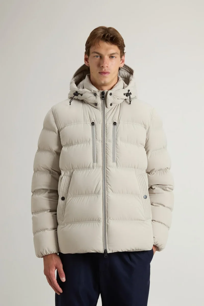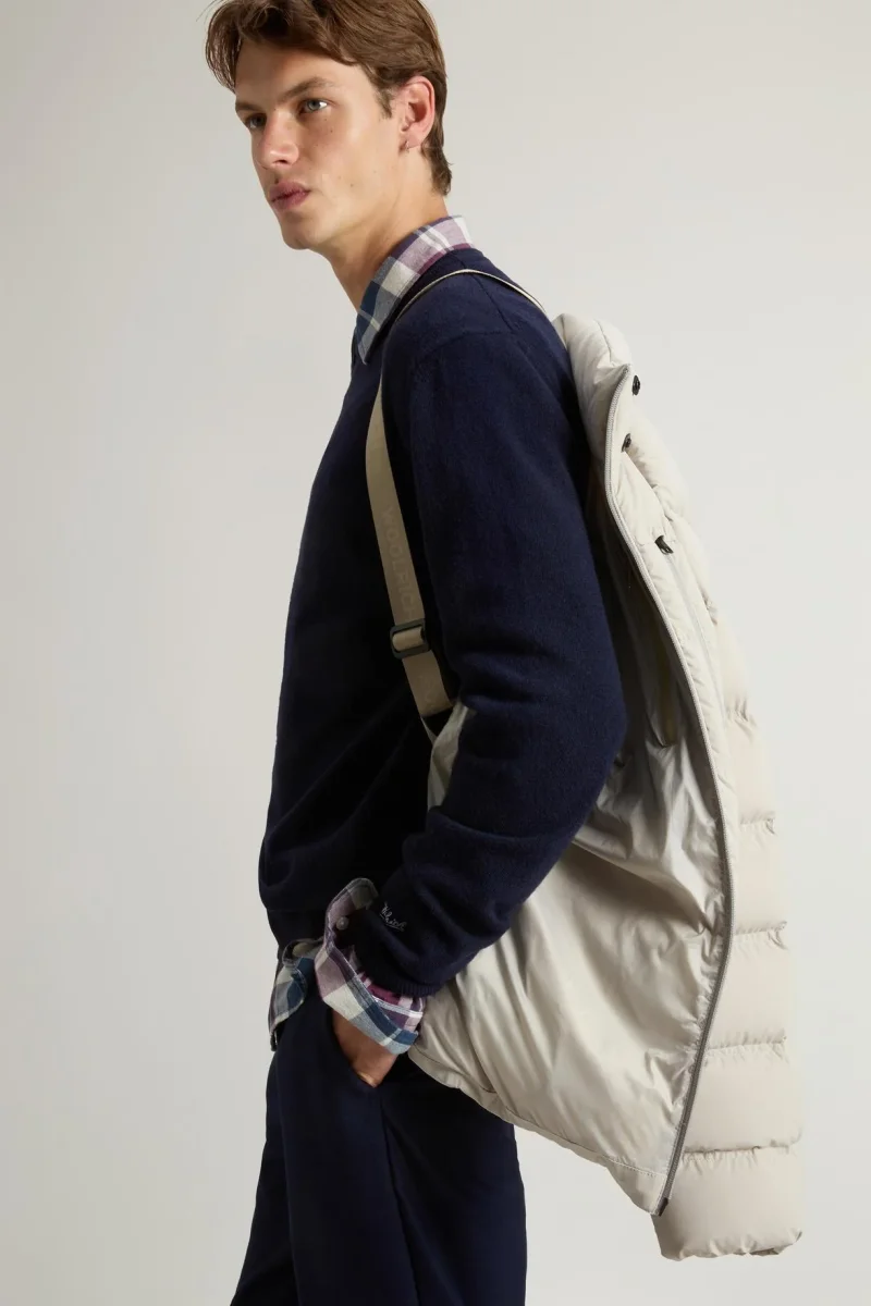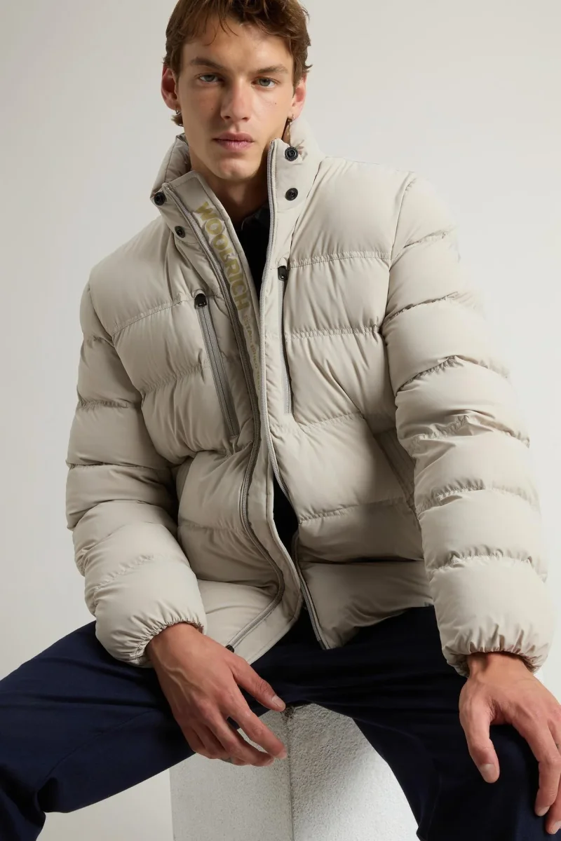 Un modello perfetto per la stagione fredda, pratico e avvolgente. Realizzato in nylon elasticizzato, questo piumino è idrorepellente, resistente al vento ed è imbottito in calda piuma d’anatra. Il modello presenta elementi funzionali come il cappuccio rimovibile, regolabile con fermacorda e dotato di visiera logata, la chiusura con zip bidirezionale e cinque tasche: due scaldamani con zip, due laterali a filetto con bottoni a pressione e una tasca interna con zip. Il collo alto assicura maggiore protezione, mentre la coulisse interna in vita migliora la vestibilità. Completano il modello le bretelle interne con logo, pensate per facilitarne il trasporto, e il logo sulla parte interna dell’abbottonatura, visibile solo quando il capo è aperto.