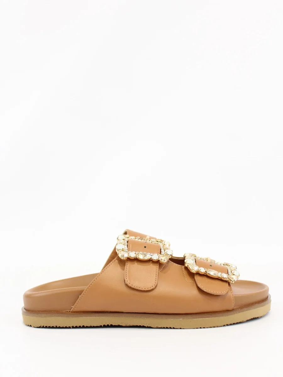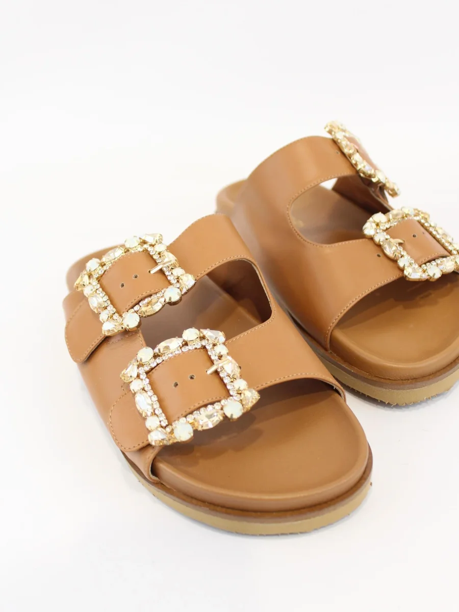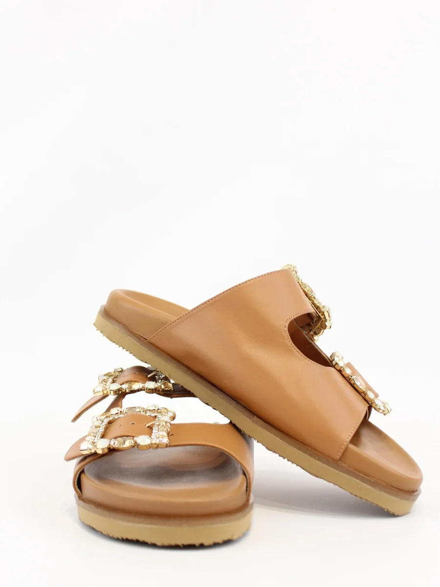 Ciabatta Paola Fiorenza, doppia fascia con cristalli, tacco cuoio con gomma antiscivolo, suola in cuoio toscano con logo