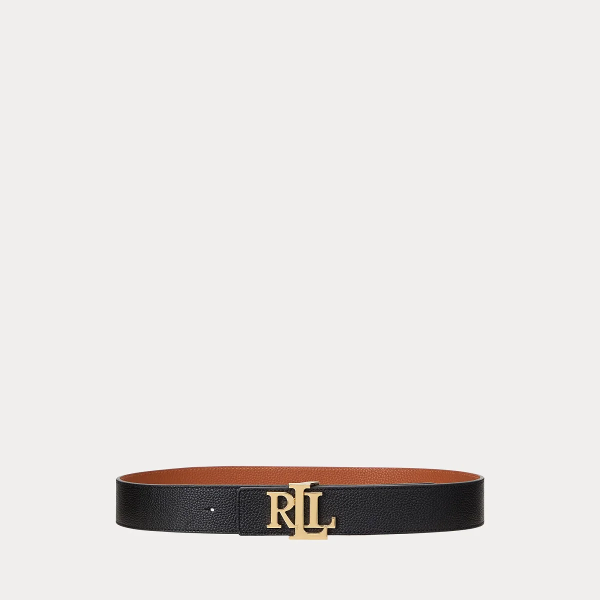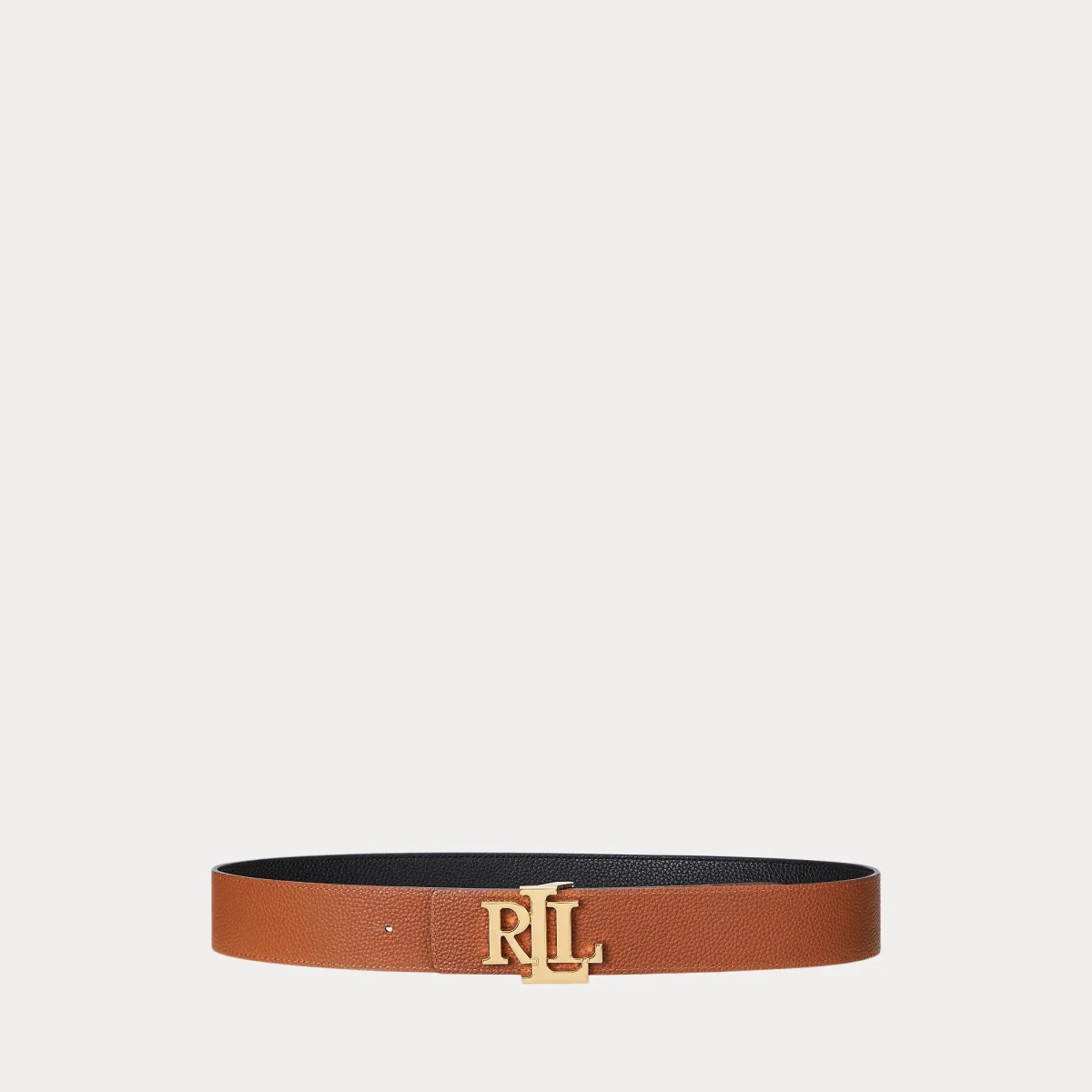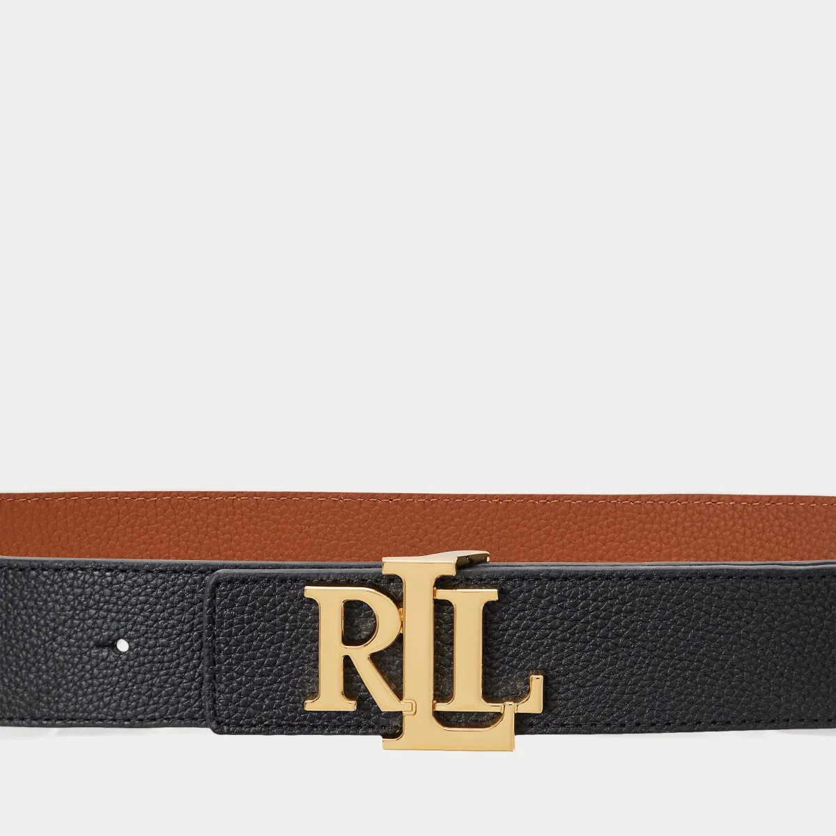 Cintura Ralph Lauren donna, modello in pelle groffata e reversibile, design largo con logo oversize in contrasto oro, colore cuoio e nero