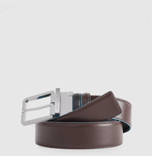 Cintura uomo Piquadro, modello reversibile con fibbia ad ardiglione, interno e bordi a contrasto linea Blue Square, colore nero e mogano