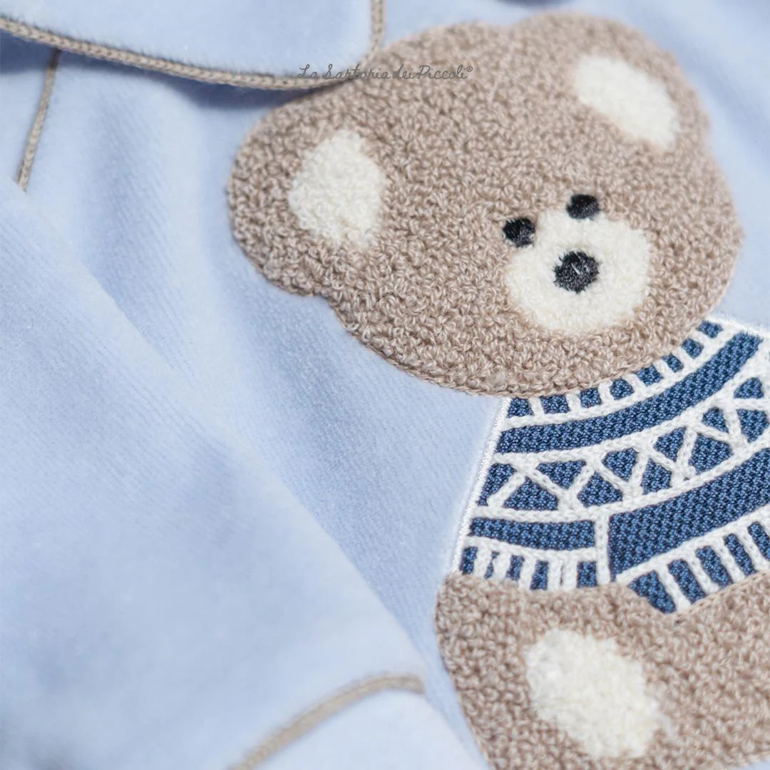 Completino due pezzi La Sartoria dei Piccoli, maniche lunghe e pantalone con piedini, realizzato in morbidissima e calda ciniglia di cotone, grande ricamo centrale con orsetto, colore azzurro