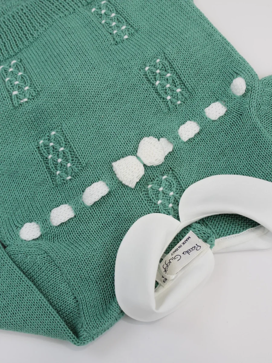 Completino Piccola Giuggiola neonato, modello due pezzi realizzato in cotone biologico, composto da maglia maniche lunghe con ricami fatti a mano in contrasto e collo peter pan, chiusura posteriore, pantalone elasticizzato in vita