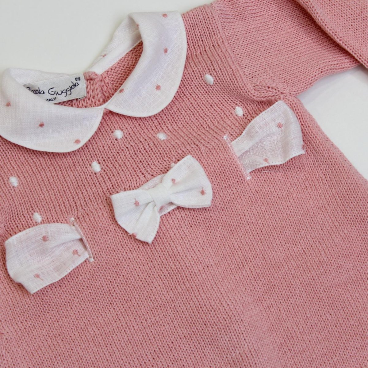 Completino nascita Piccola Giuggiola, girocollo in contrasto, chiusura bottoncini nella parte posteriore, dettaglio ricamati sul davanti. Pantaloncino elasticizzato in vita con fondo in contrasto.