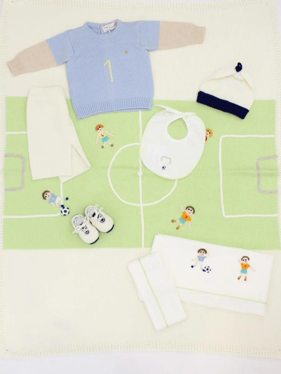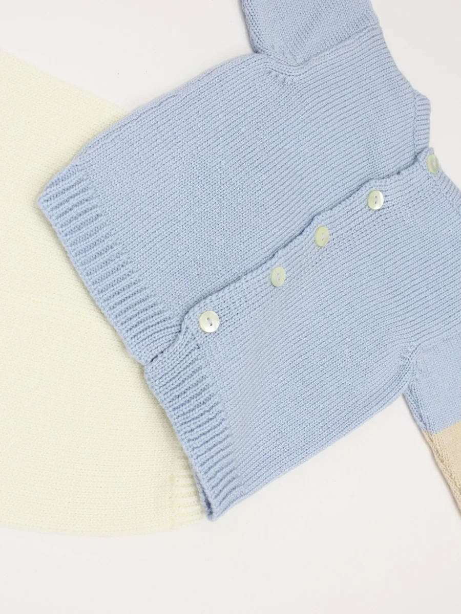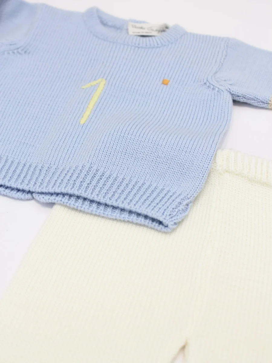 Completino Vialli Piccola Giuggiola, modello due pezzi, realizzato in lana, lavorato a mano con dettaglio numero 1, maniche lunghe e girocollo, chiusura posteriore con bottoni