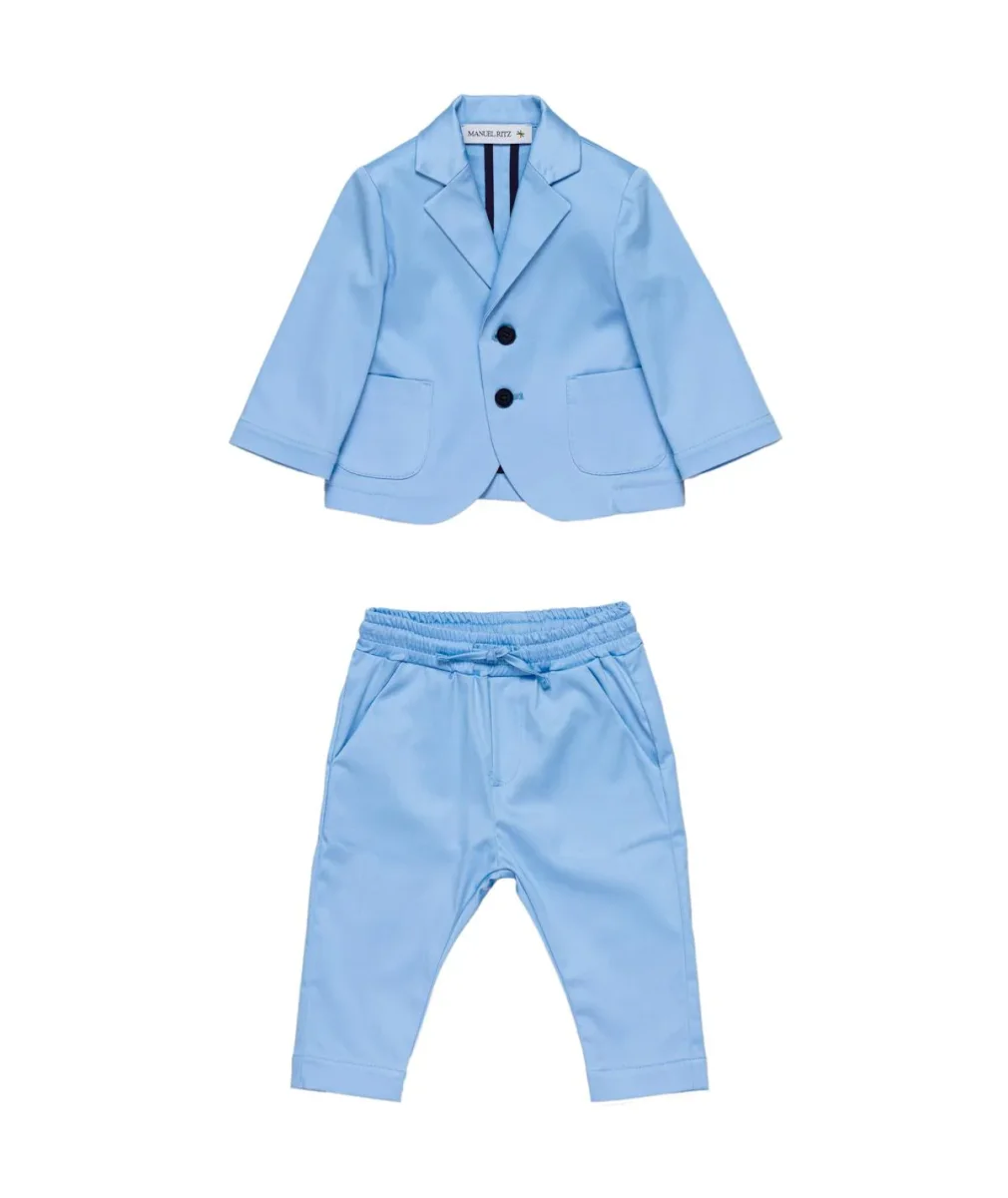 Completo cerimonia neonato, composto da due pezzi. Giacca con bottoni in contrasto, pantalone con coulisse in vita e tasche laterali. Color cielo