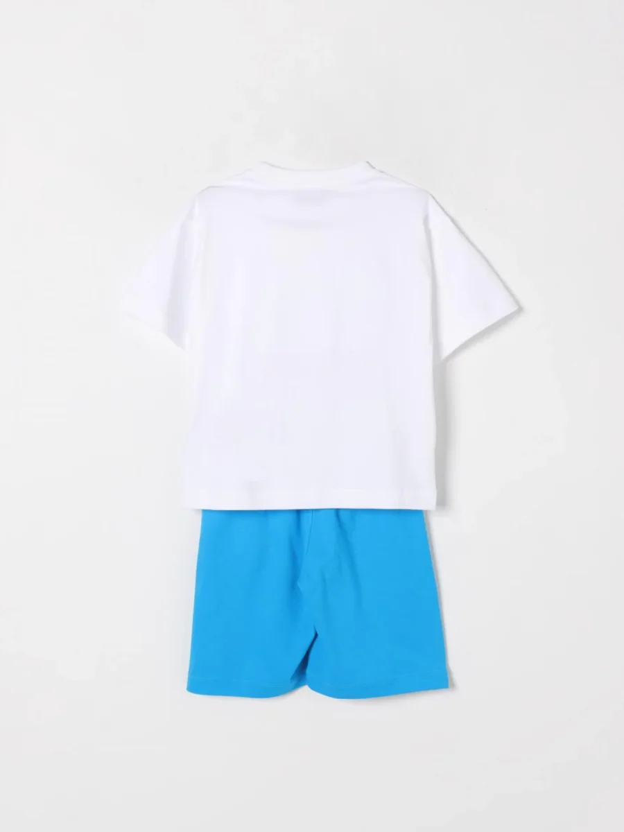 Coordinato bimbo, composto da t-shirt maniche corte e girocollo, dettaglio con stampa orsetto in contrasto surf, shorts con logo in contrasto laterale