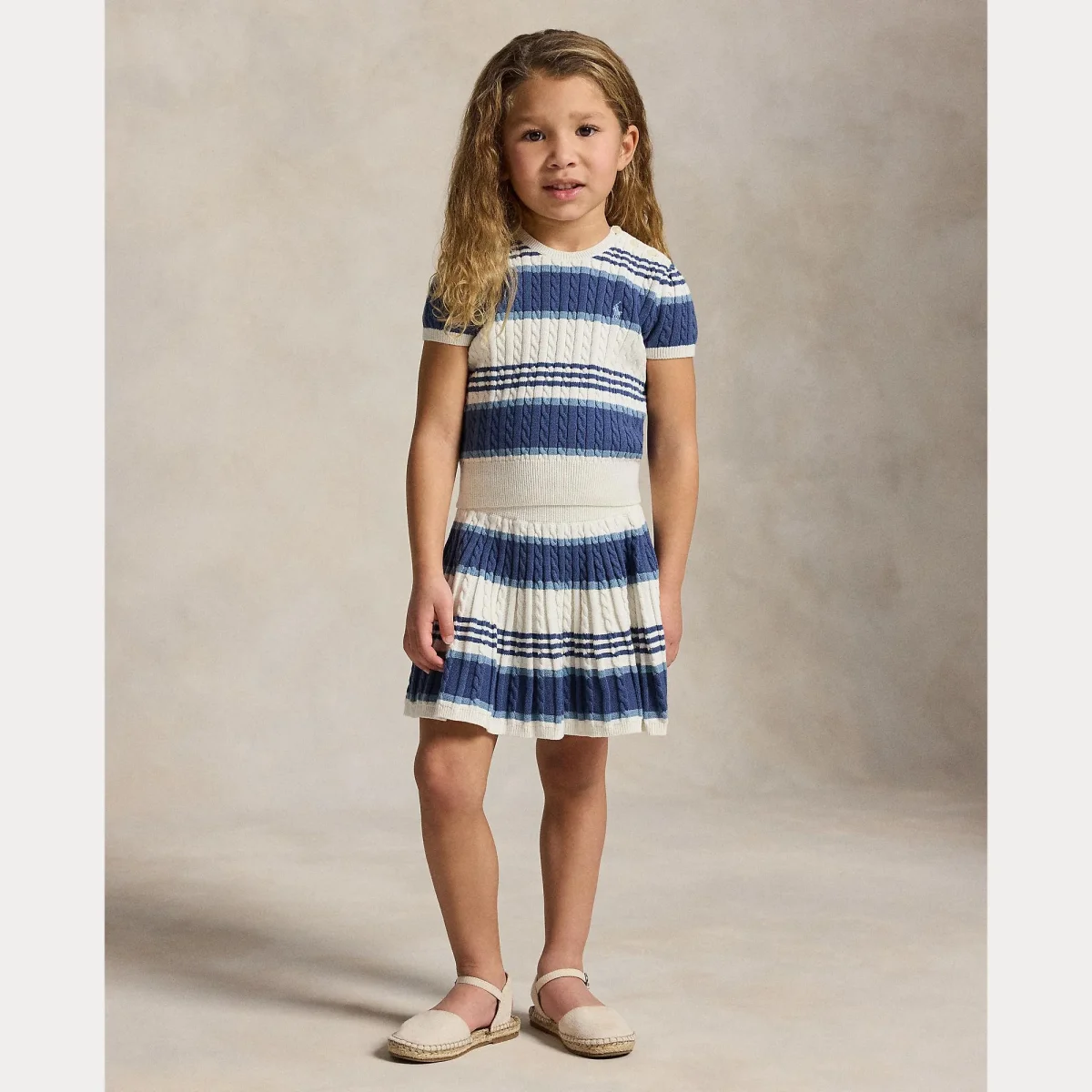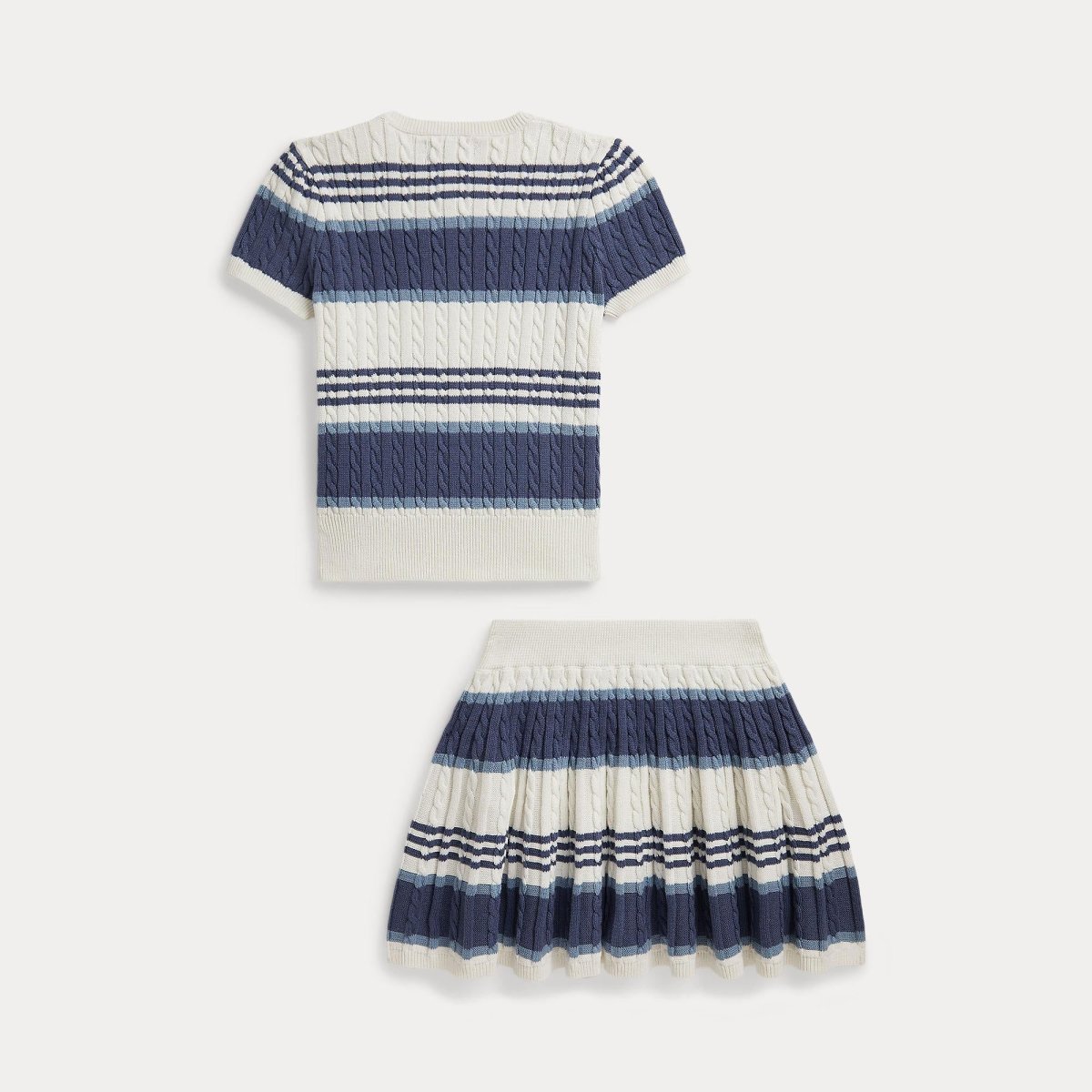Completo due pezzi, design a coste New England, righe blu a motivo mini trecce, realizzati in cotone pettinato, colore blu