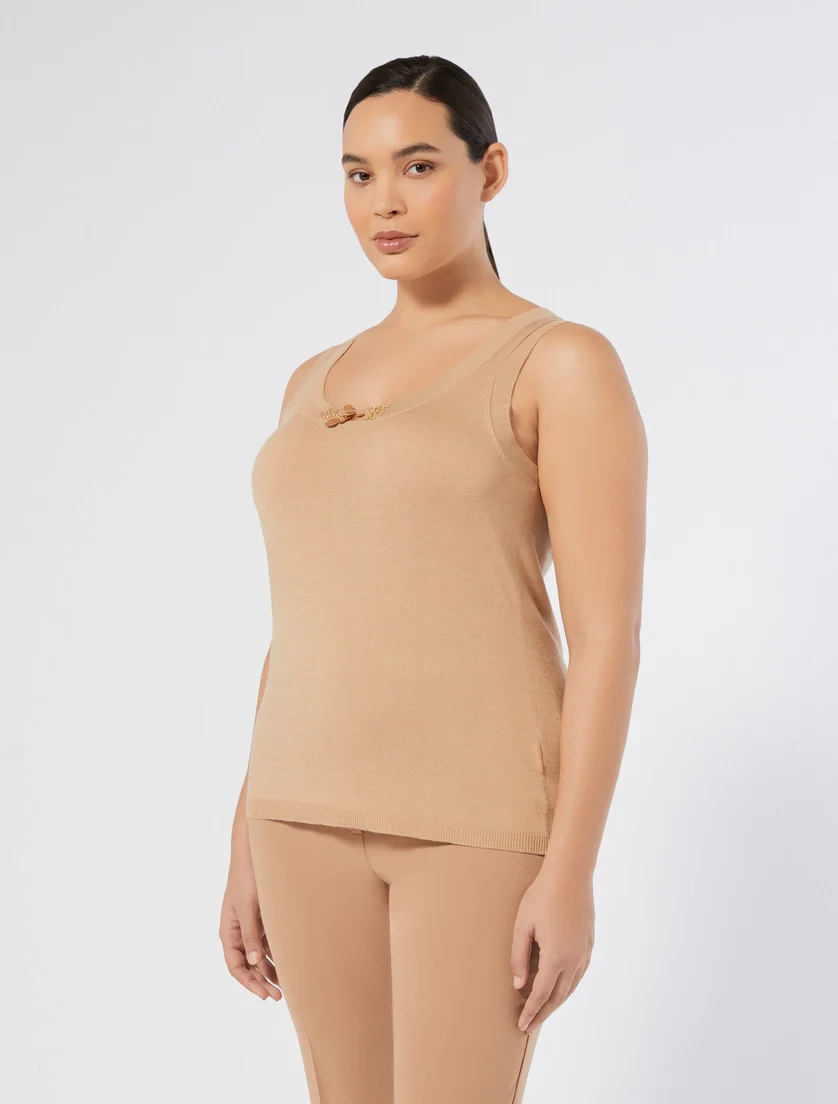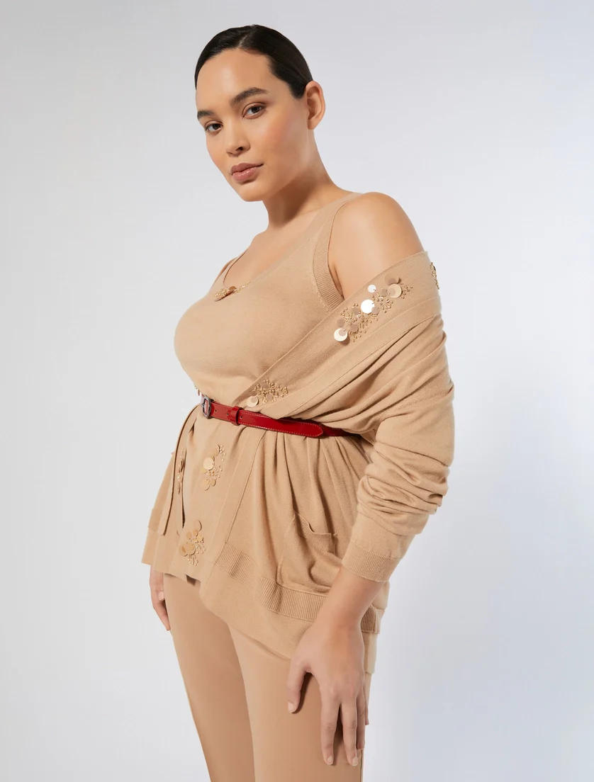 Top con ricami fatti a mano, maniche lunghe, tasche applicate, fondo effetto doppio capo, top a canotta dalla linea semiaderente, cintura ricamata