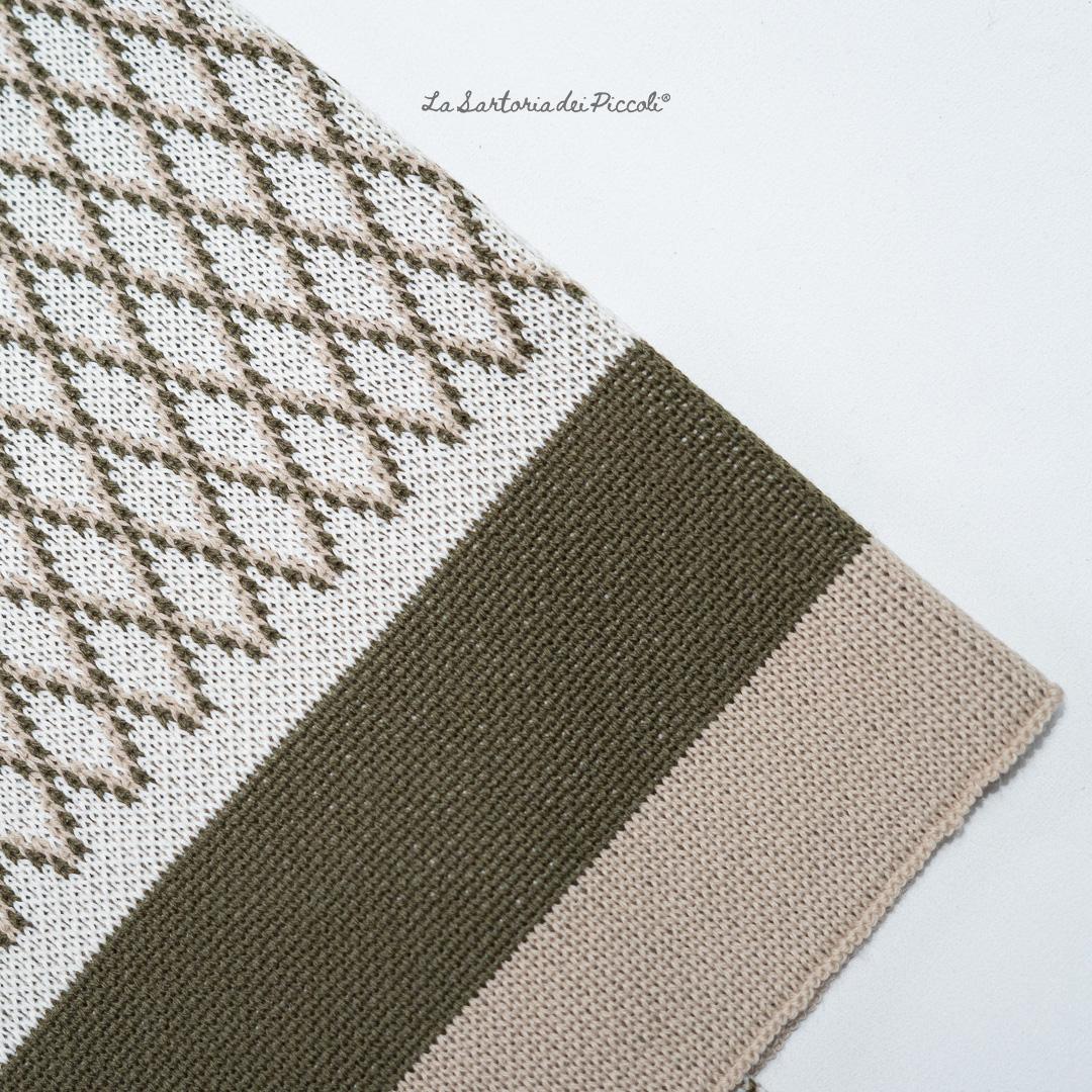 Copertina realizzata in morbida maglia di cotone, lavorazione jacquard con fantasia a rombi, finitura con due fasce a contrasto