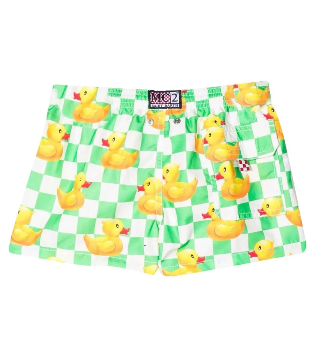 Costume Jean Mc2 Saint Barth, fantasia a quadri grand con paperelle in contrasto, logo posteriore, vita con coulisse elasticizzata.