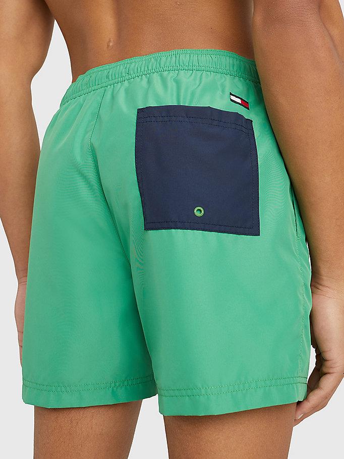 Costume uomo Tommy Hilfiger realizzato in tessuto tecnico, motivo color block, lacci in vita, tasca applicata sul retro, logo del brand in contrasto, colore verde, vestibilità slim fit