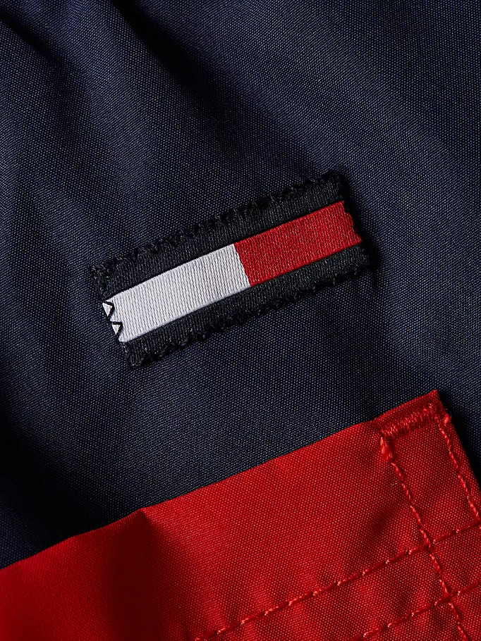 Costume uomo Tommy Hilfiger realizzato in tessuto tecnico, motivo color block, lacci in vita, tasca applicata sul retro, logo del brand in contrasto, colore blu, vestibilità slim fit