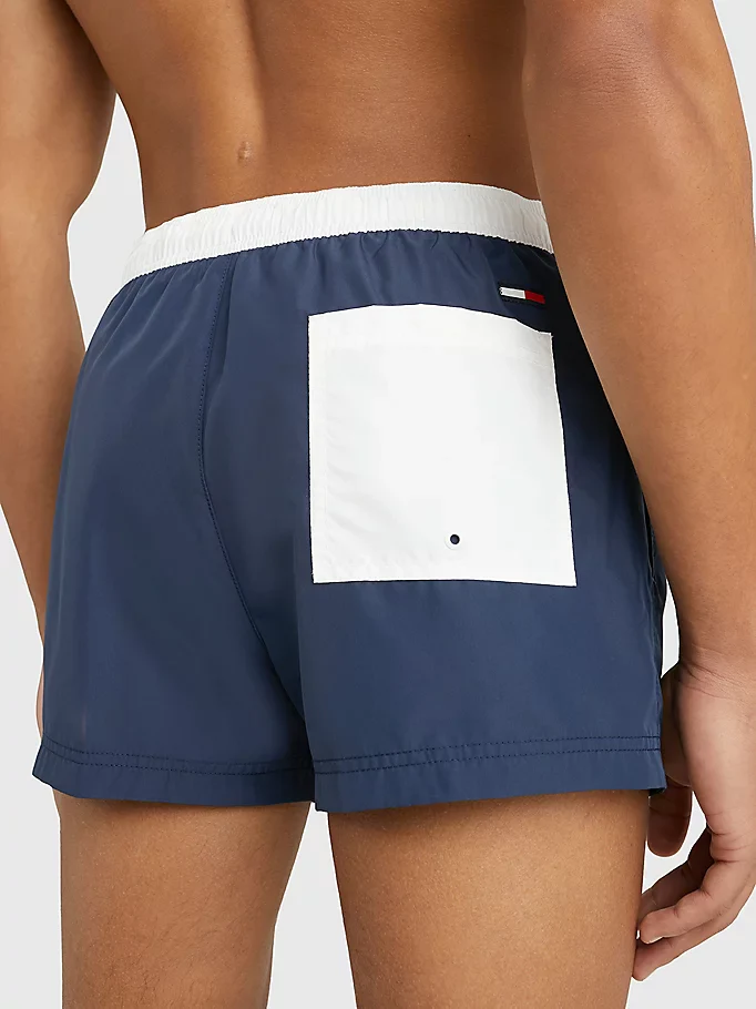 Costume Tommy Hilfiger, realizzato in tessuto tecnico, motivo color block, lacci in vita, modello corto con tasca applicata sul retro, brand Tommy Jeans, colore blu. Vestibilità slim fit