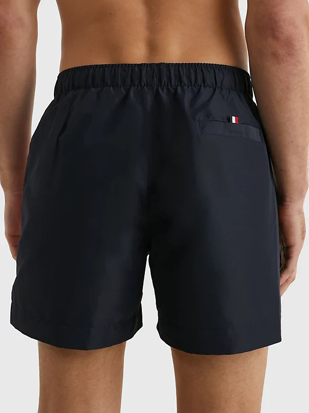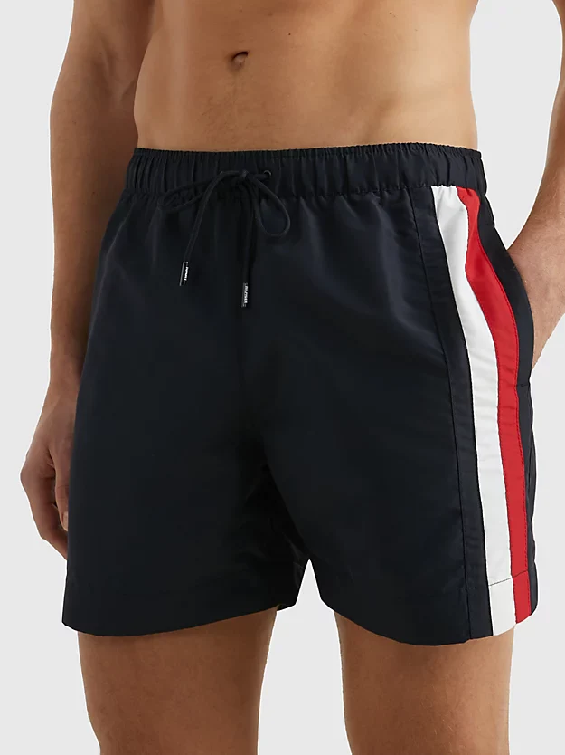 Costume shorts Tommy Hilfiger uomo, modello in tessuto tecnico riciclato, lacci in vita, nastro iconico lungo la gamba, lunghezza media, logo in contrasto blu