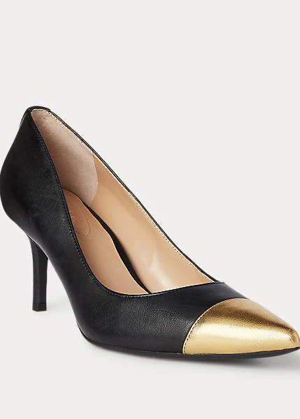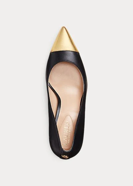 Dècollète donna Ralph Lauren, modello a punta rinforzata in pelle metallizzata, dettaglio con logo sul tallone, striato in cuoio, soletta imbottita in pelle, colore nero/oro
