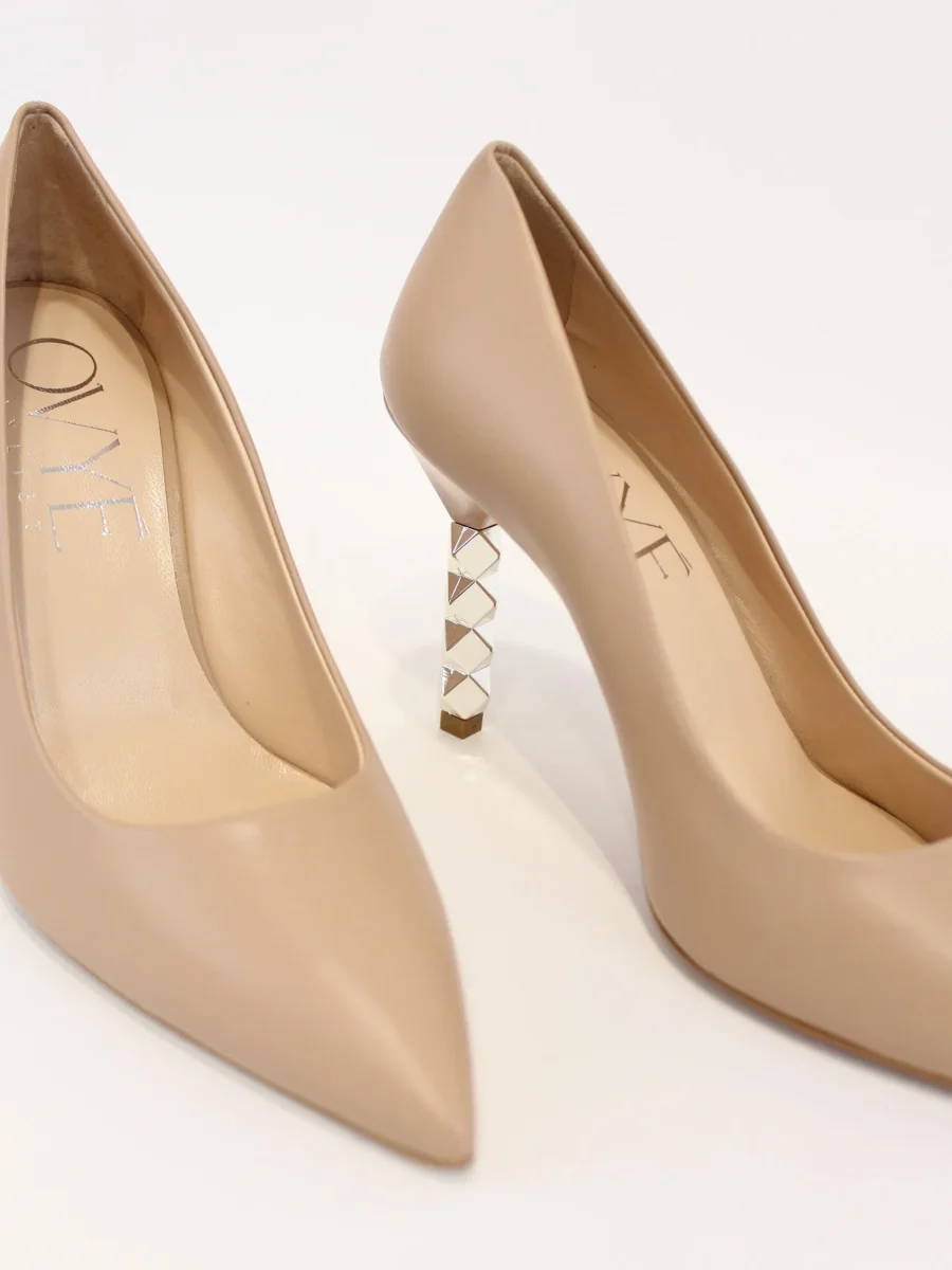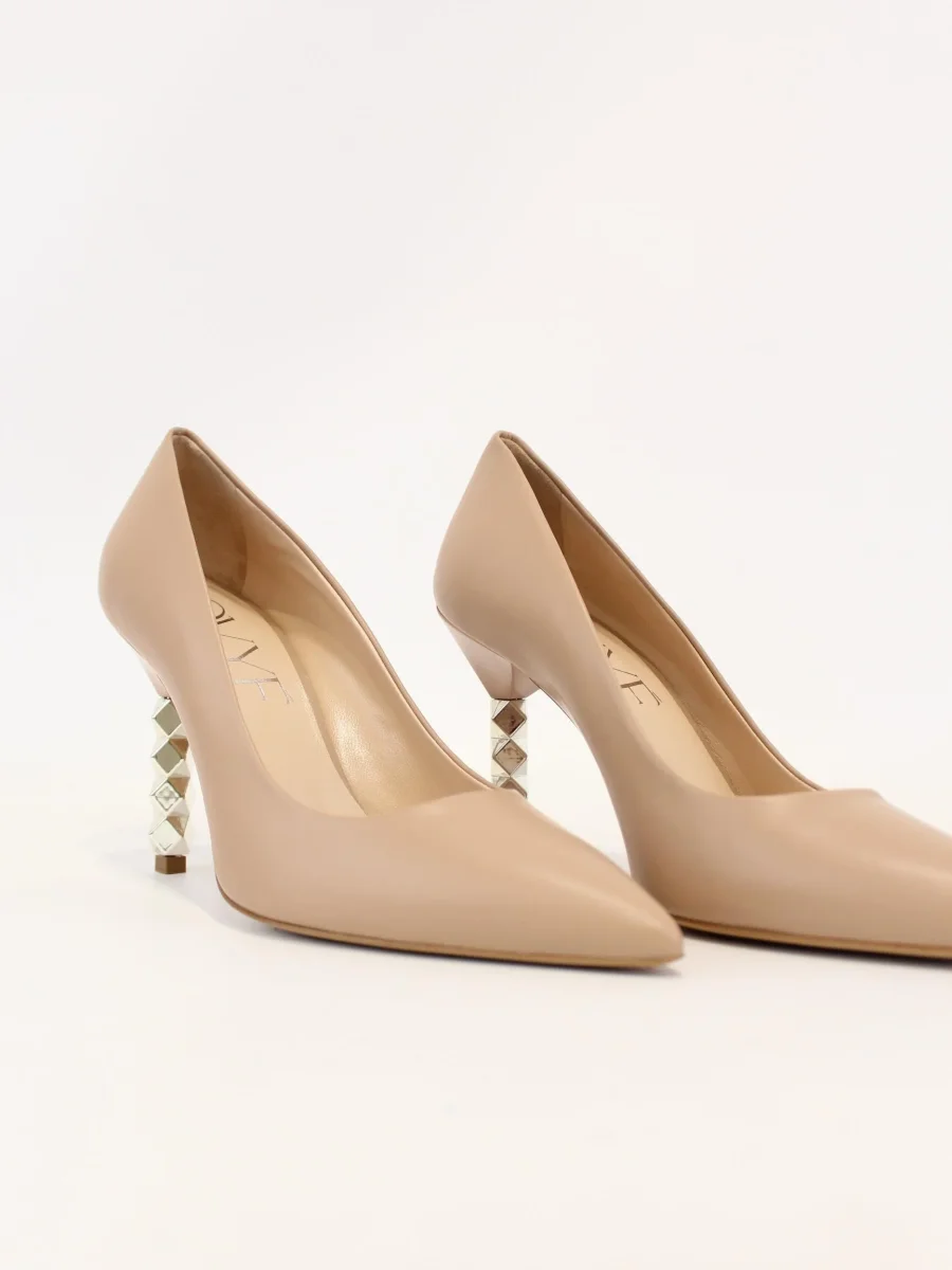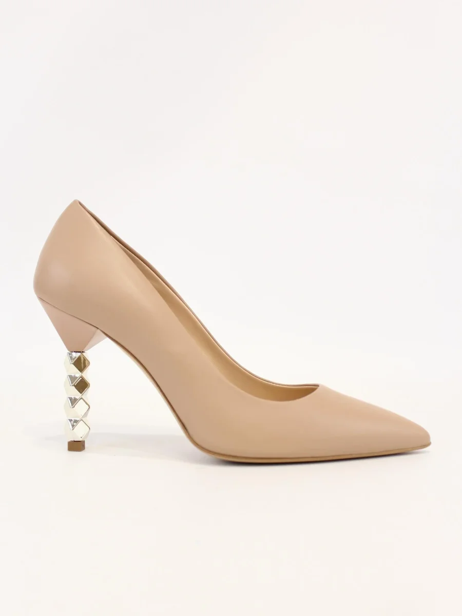 Dècollette con tacco in contrasto design romboidale argento, punta fina, collo aperto, colore nude