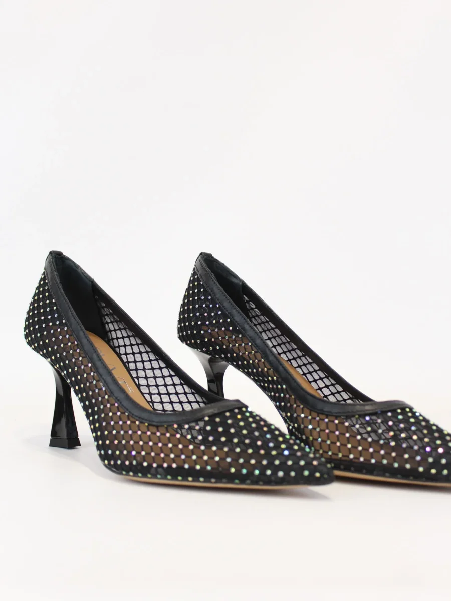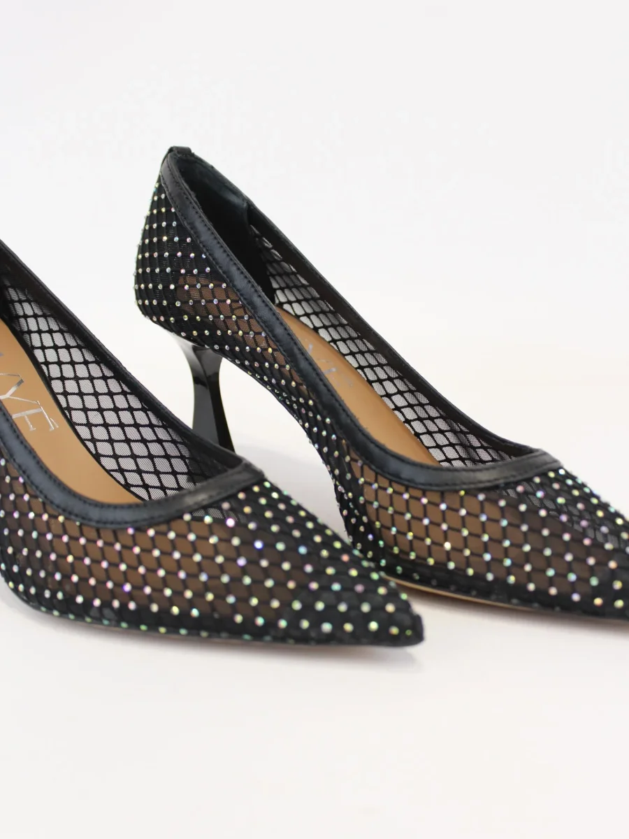 Dècollette donna Ovyè, modello con effetto vedo non vedo, applicazioni strass multicolor all over, tacco quadrato, punta fina, colore nero