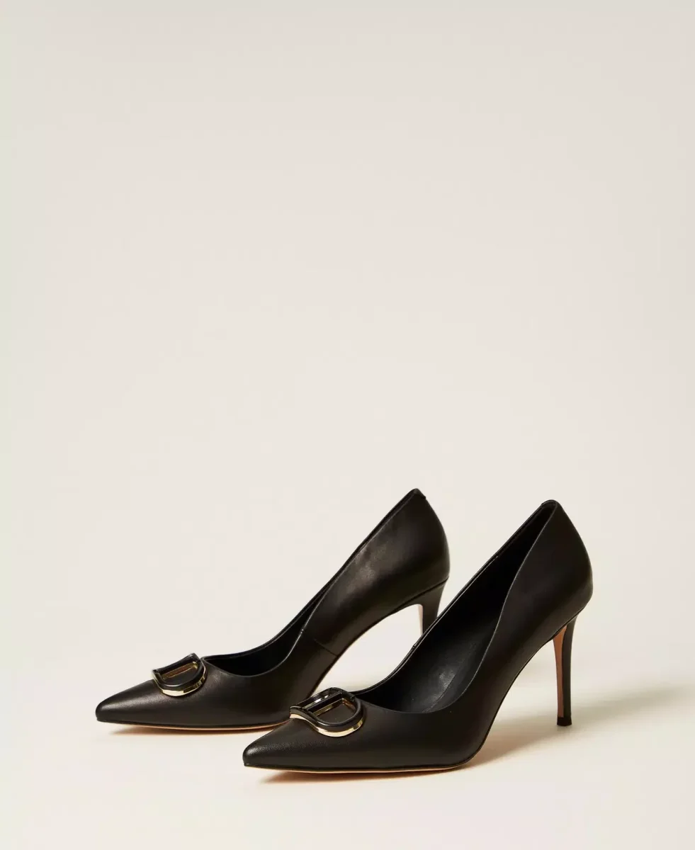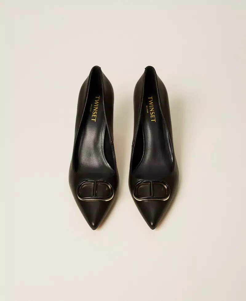 Dècollettè in pelle con logo Oval T smaltato in tono, punta sfilata, tacco e fondo in tunit, colore nero