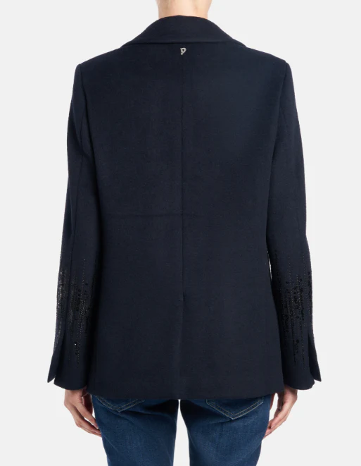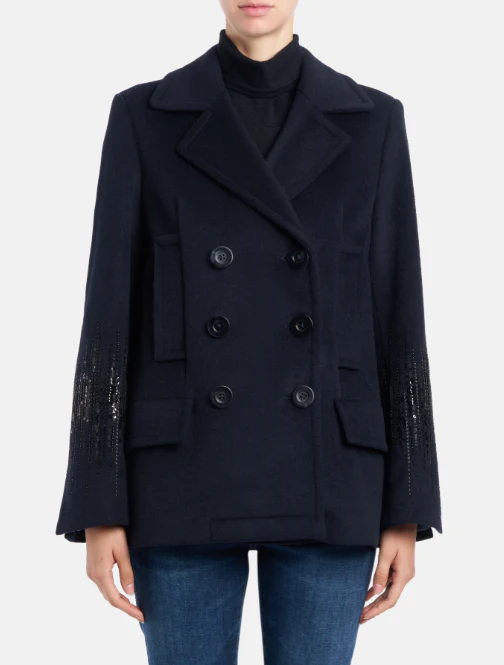 Peacoat Dondup donna, modello doppiopetto regular a sei bottoni, con tasche a filetto e tasche con pattina, ricamo in pailettes e perline su maniche, colore blu