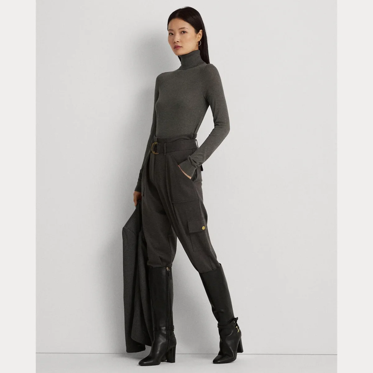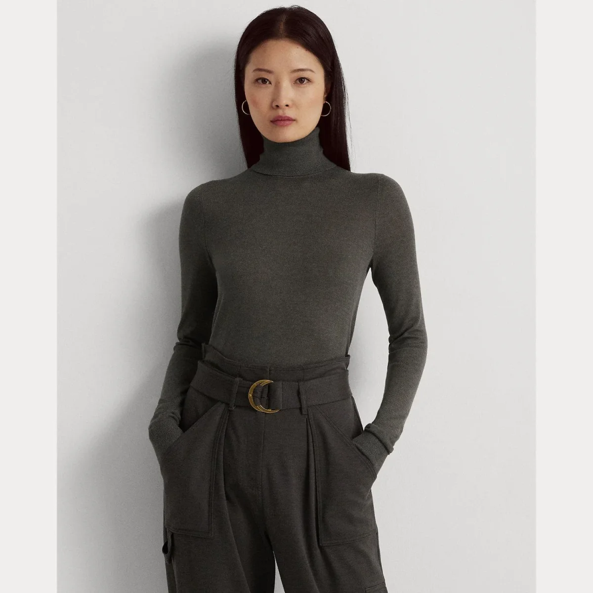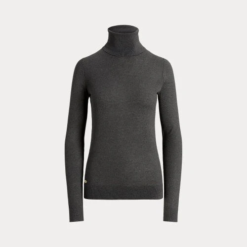 Dolcevita in misto seta Lauren Ralph Lauren, vestibilità slim, modello a costine con maniche lunghe, placca metallica con incisione, colore grigio