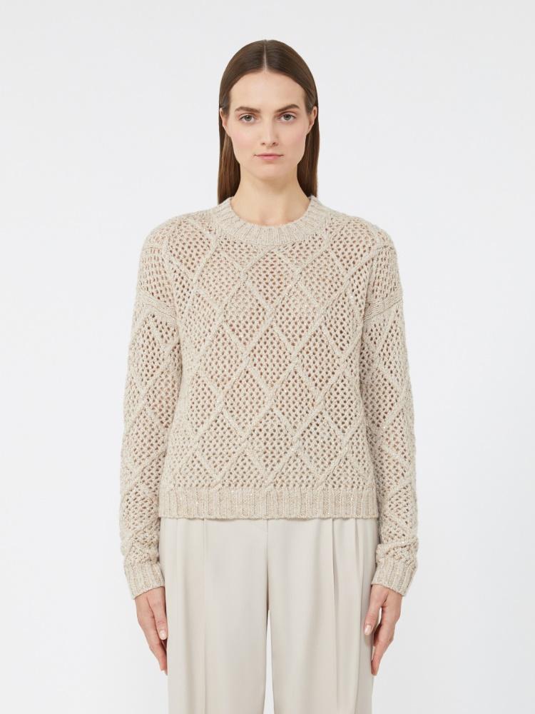Maglia in filato di lana e cachemire, vestibilità boxy con taglio crop, girocollo e bordi a costine, maniche lunghe, motivo a losanghe, colore beige