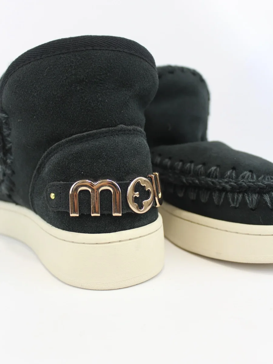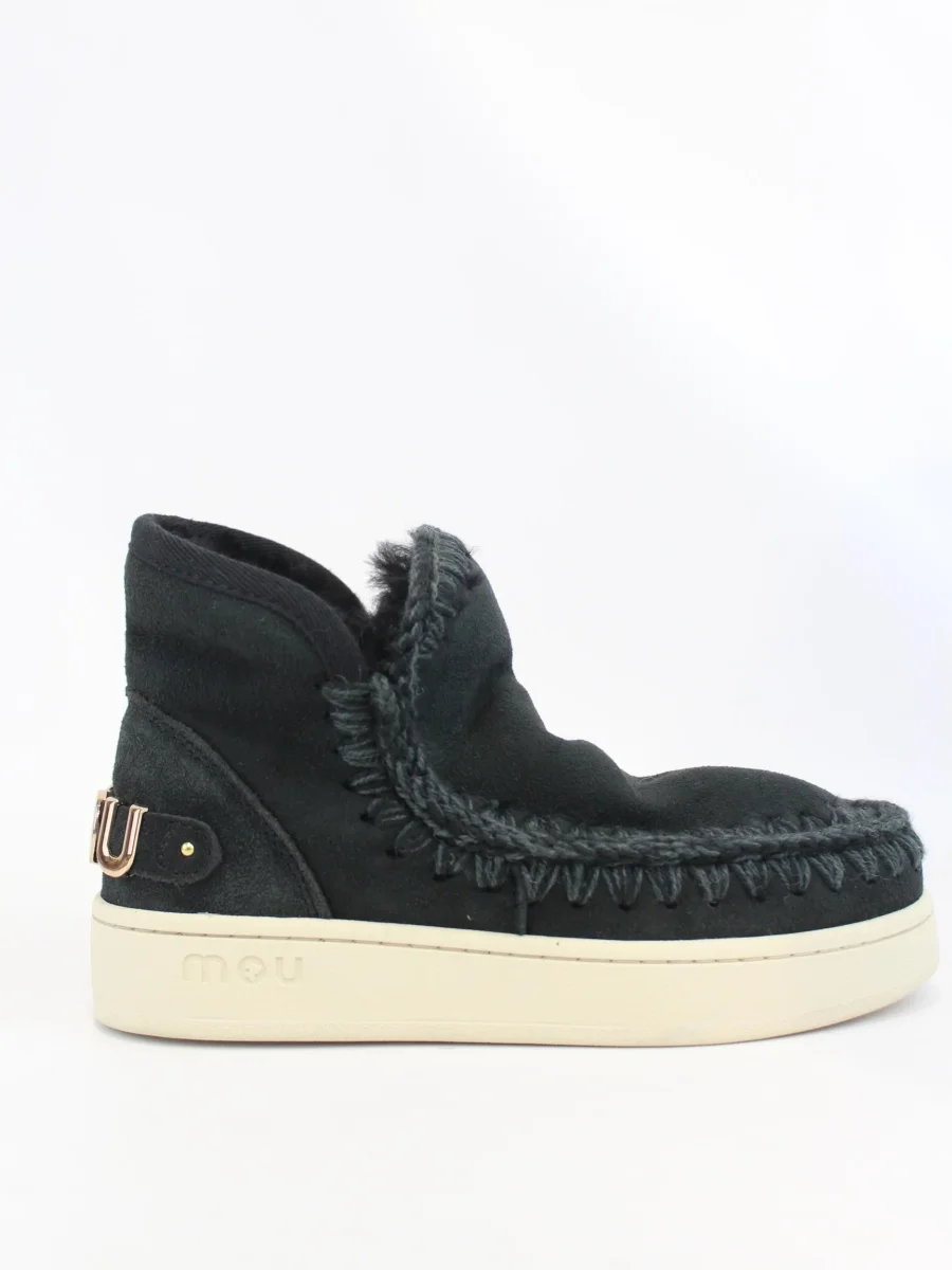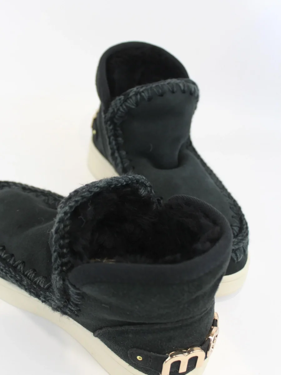 Mini eskimo platform Mou, realizzata in pelle di pecora double face, cuciture in lana all’uncinetto, suola in EVA e gomma, colore nero