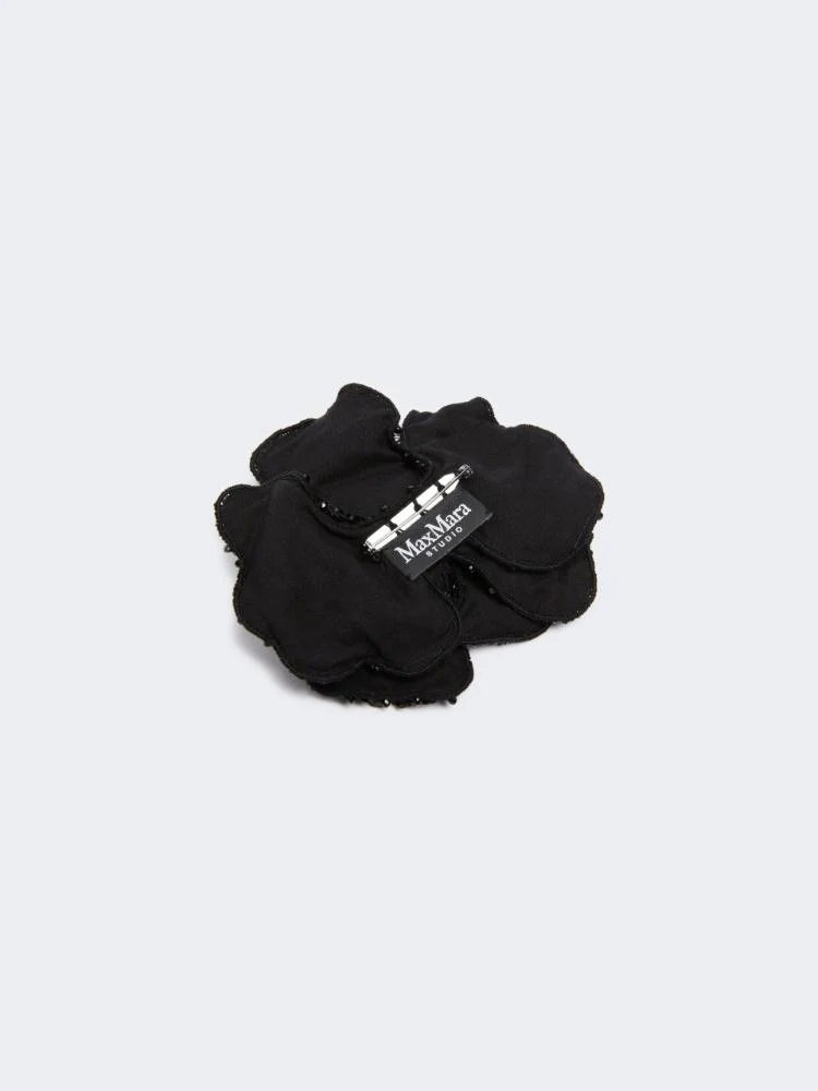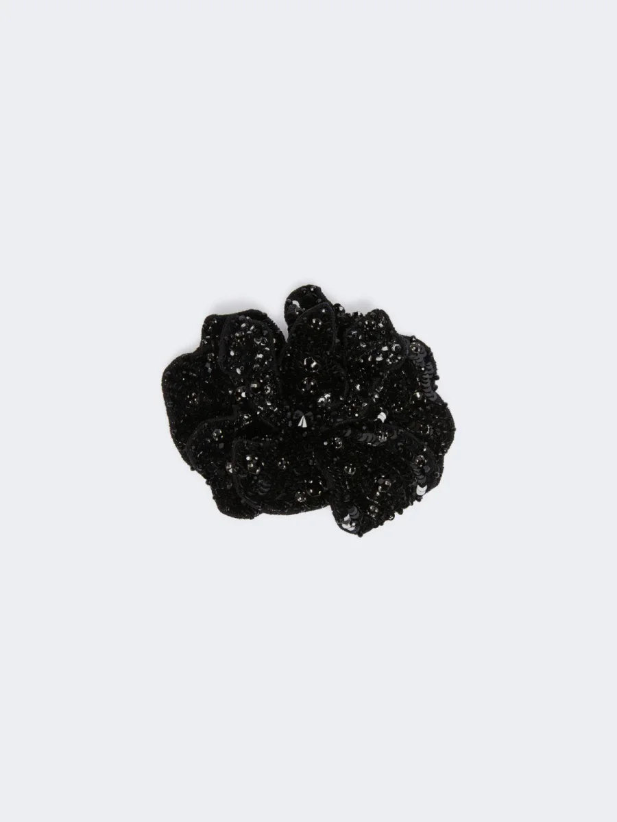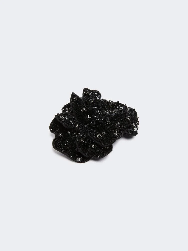 Spilla in mussola di cotone con anima in metallo, ricamo di jais, castoni e pailettes all over, logo sul retro, chiusura con moschettone, colore nero