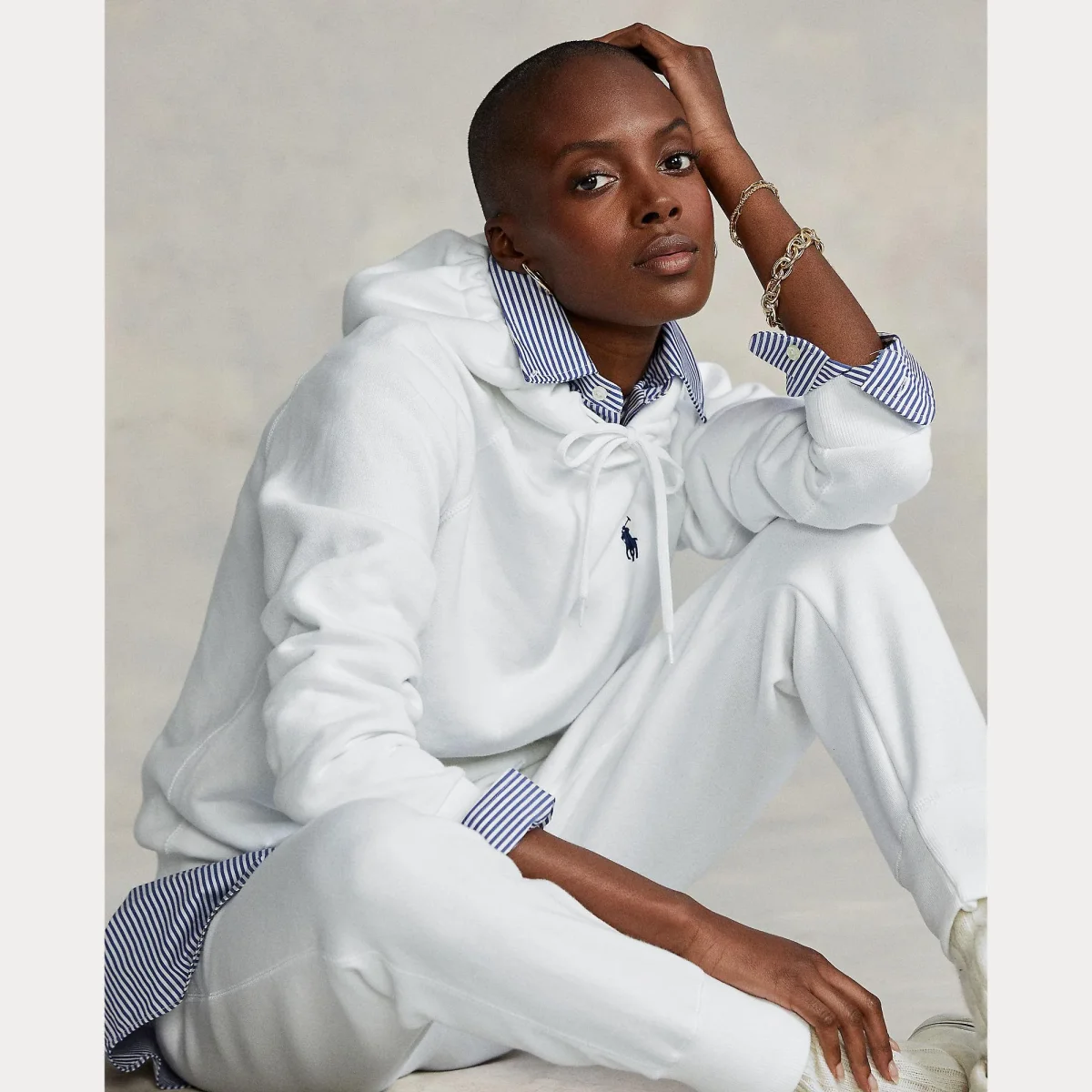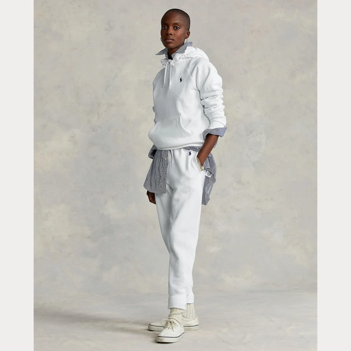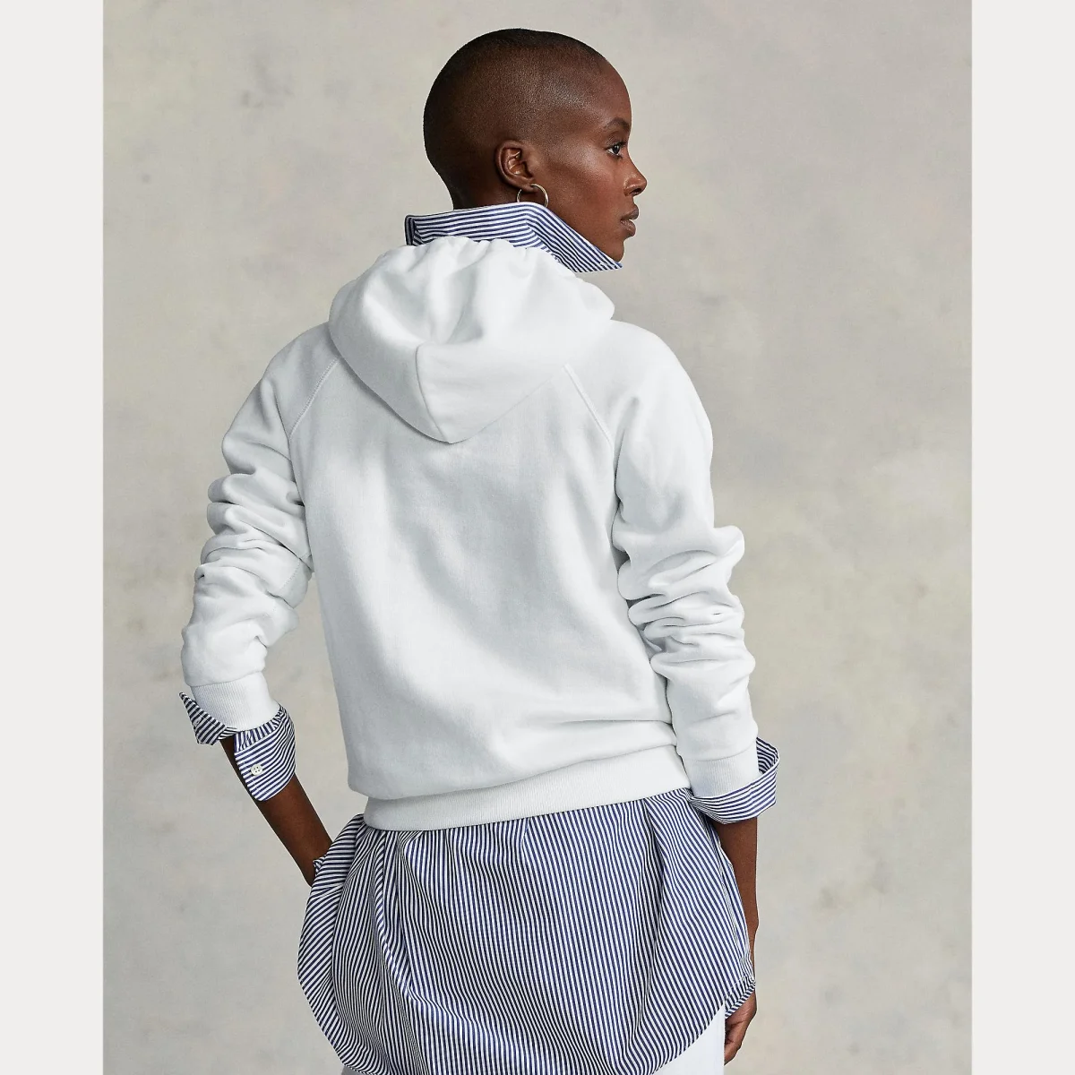 Felpa realizzata in morbido pile, modello con cappuccio con coulisse, logo iconico cavallino ricamato sul petto, colore bianco