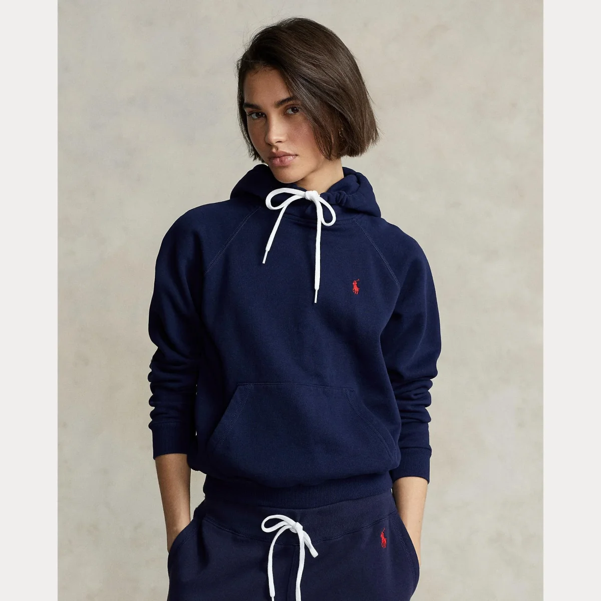 Felpa realizzata in morbido pile, modello con cappuccio con coulisse, logo iconico cavallino ricamato sul petto, colore blu