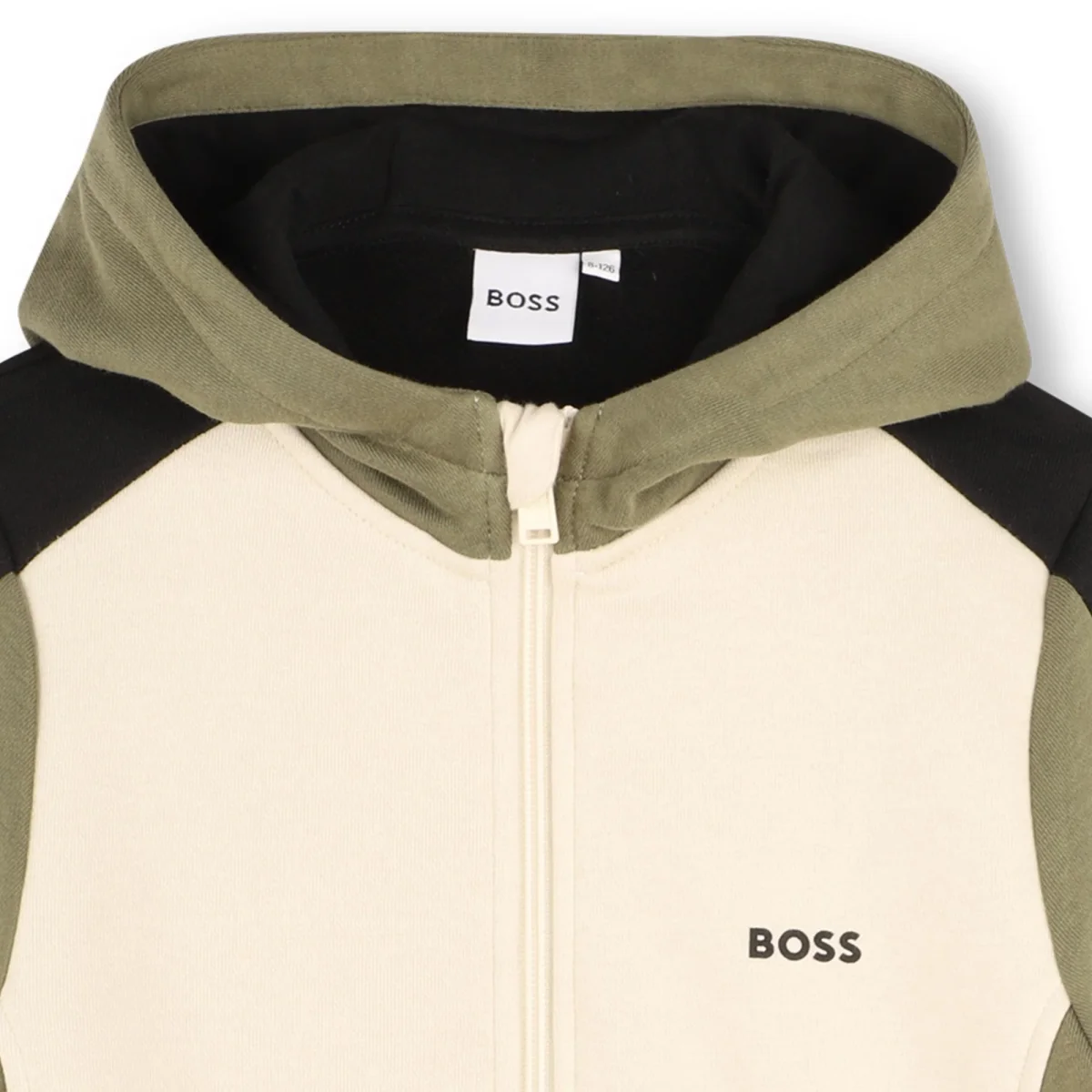 Felpa Boss bimbo, modello full zip, collo con cappuccio, fantasia multicolor e dettaglio logo in contrasto sul petto